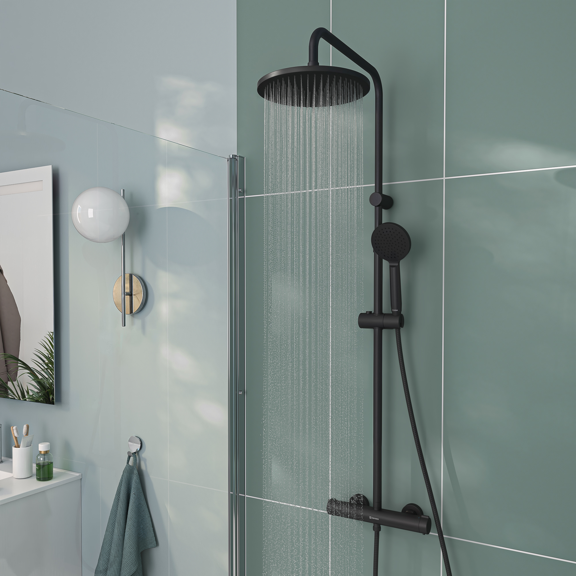 Conjunto de ducha termostático Sensea serie Essential, con tubo de acero inoxidable y acabado color negro mate con rociador y alcachofa redondos. Su forma simple se adaptan fácilmente al ambiente de tu baño. Diseñado para satisfacer tus necesidades, su soporte de pared se puede ajustar en altura durante la instalación. El rociador de ducha de 23 cm de diámetro cuenta con 5 chorros distintos. Tanto el rociados como la alcachofa son fáciles de limpiar gracias a sus muescas antical. El diseño de este producto fue desarrollado en Francia por el equipo de Sensea. Este producto ofrece una garantía de 5 años.