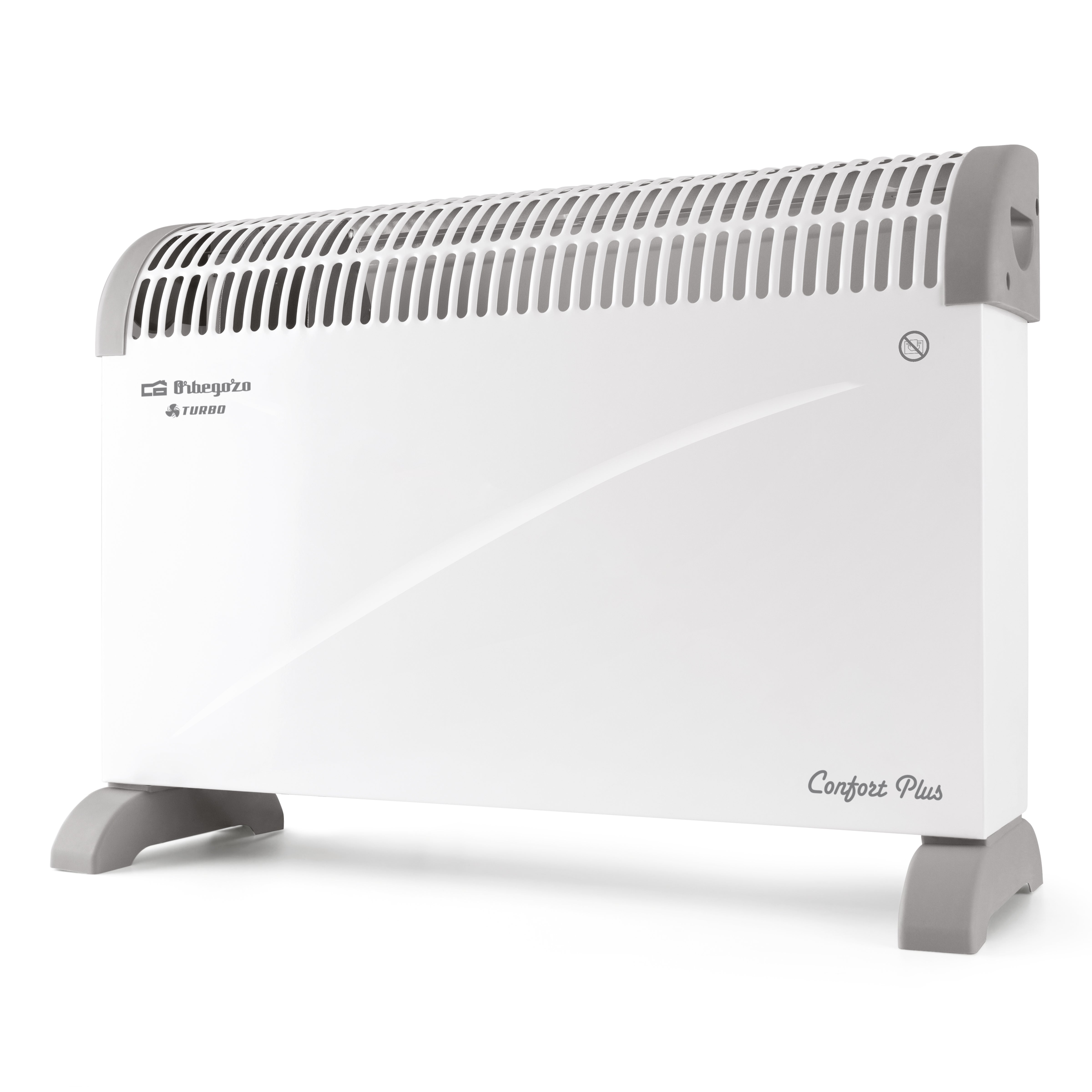 Convector. 3 niveles de potencia: 750, 1.250 y 2.000 W. Turbo.Termostato regulable. Fusible de seguridad. Interruptor luminoso. Asas para transporte. Medidas: 590x420x200mm.