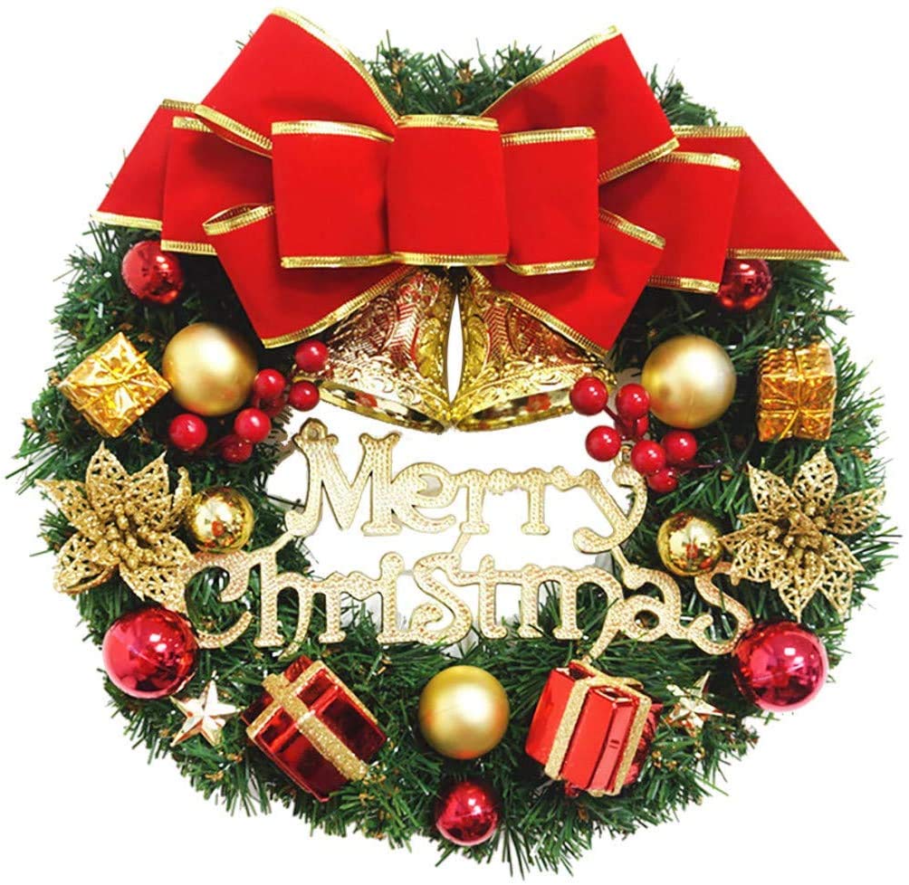 Corona navideña de 30 cm con adornos y lazo, decoración navideña, corona navideña artificial para puerta con campanas, guirnalda de Feliz Navidad