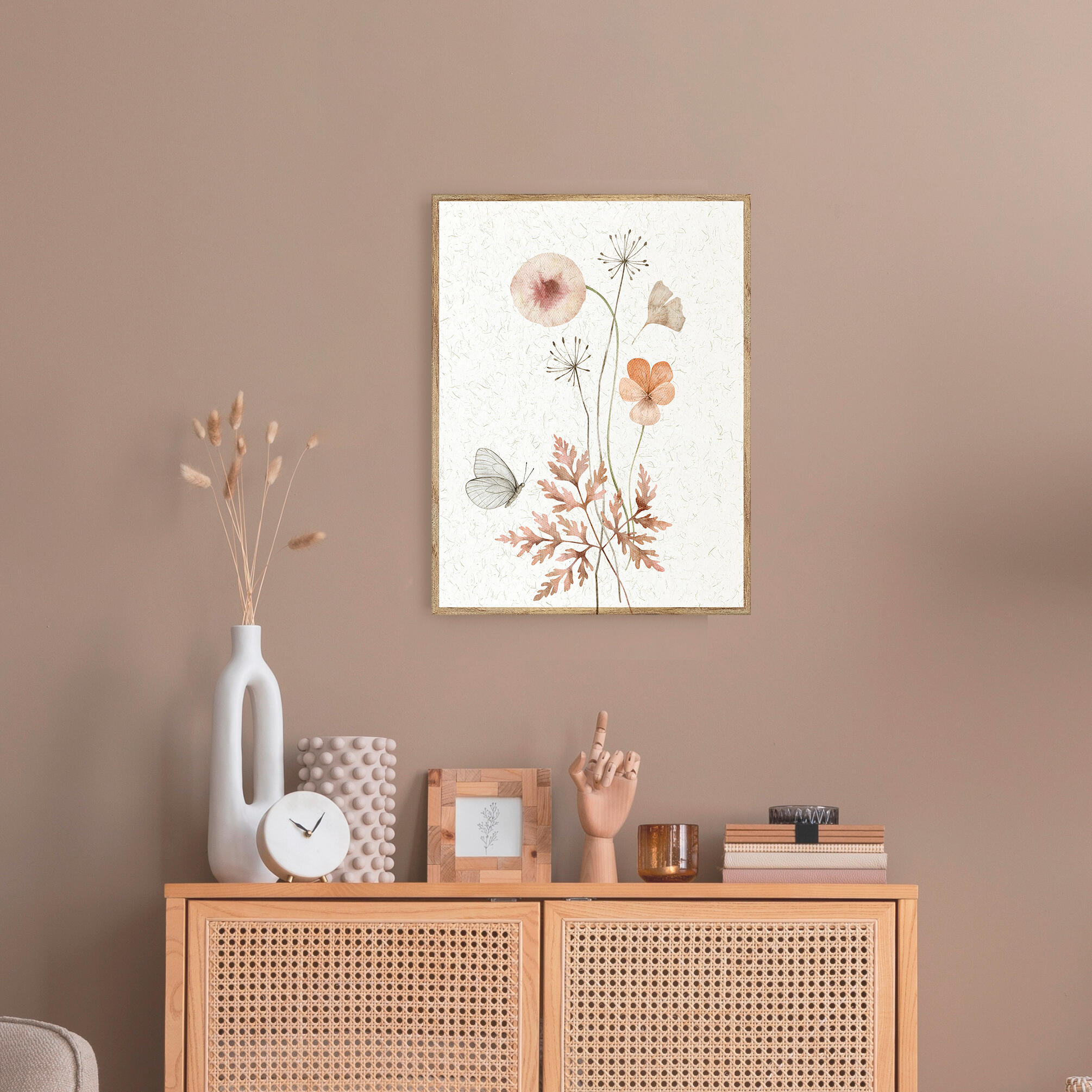 Cuadro con moldura BCN 20mm en color haya G tostado. Diseño de unas flores en tonos tierra con una mariposa en fondo lino 30x40cm interior