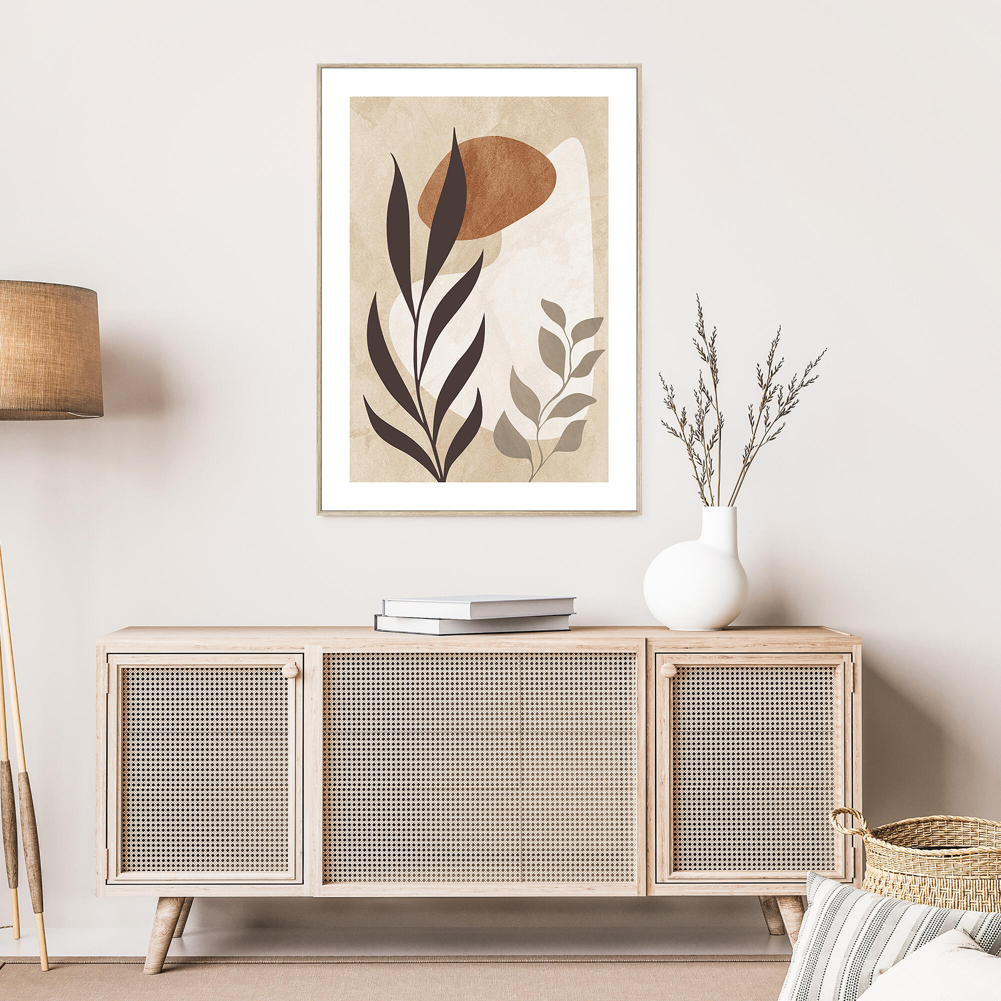 Impresión en tela de hojas en tonos marrones y enmarcado con moldura en color haya. Ideal para decorar cualquier estancia. Medidas: 50 x 70 cm.