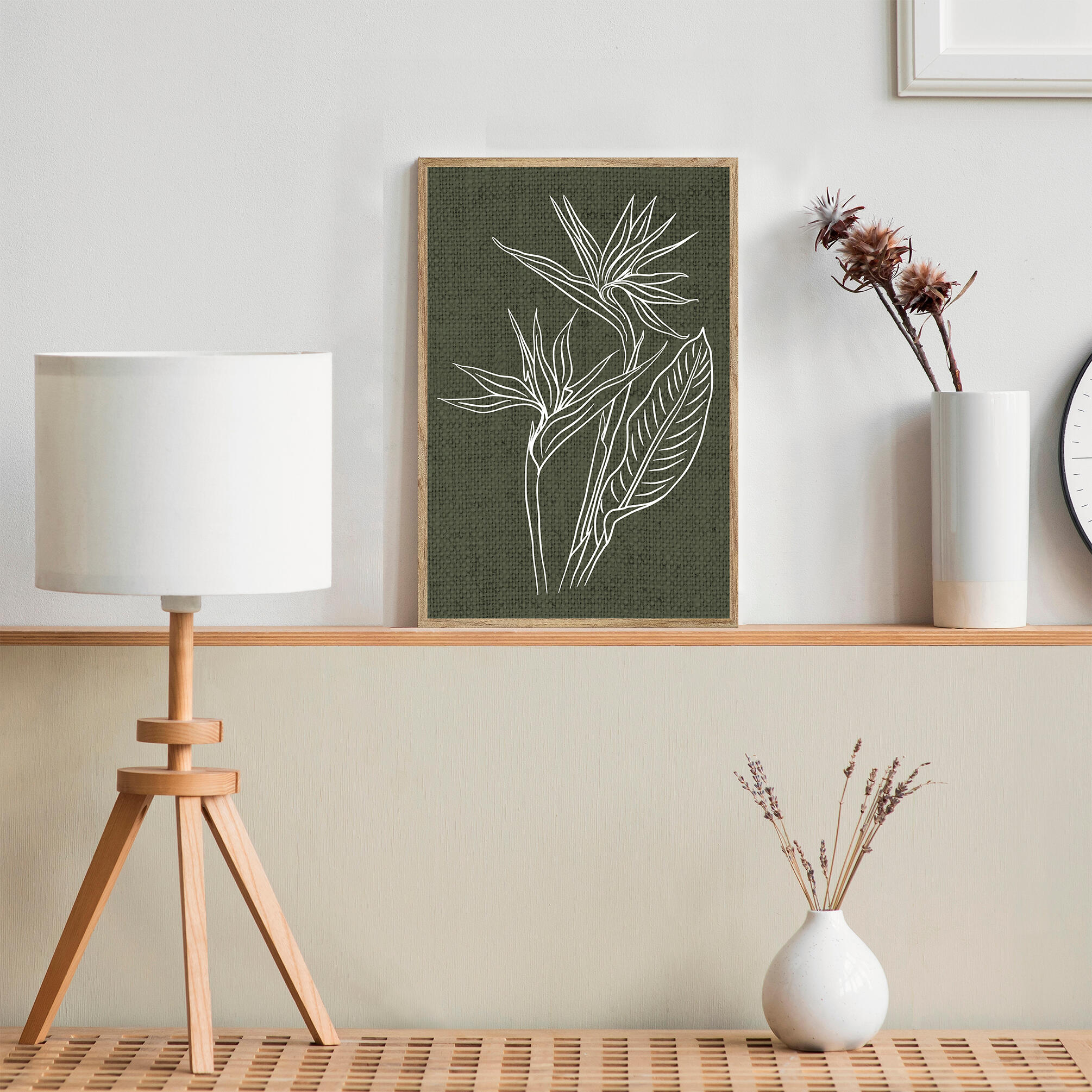 Cuadro con moldura decoart 20mm en color haya tostado con un diseño de flores de aves del paraiso sobre fondo verde impreso en relieve. Medida 20x30cm interior