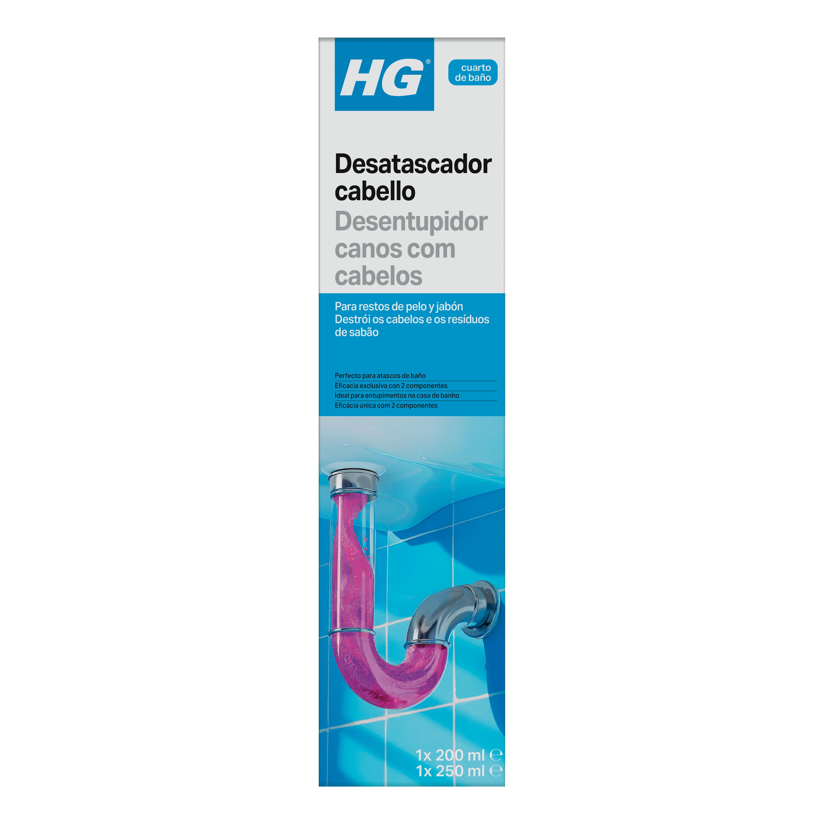 Desatascador de cabello HG 250 ml. Los cabellos son la causa de obstrucciones en los desagües, tanto del lavabo, como de la ducha y la bañera. El producto está reforzado con hidróxido de potasio, que hace desaparecer el cabello de una manera rápida y que lo disuelve completamente.