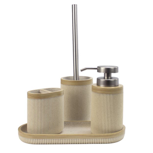 Dispensador de jabón líquido con diseño moderno y elegante. Disponible en 3 colores: blanco, beige y negro. Este artículo forma parte de la serie Desert que consta de escobillero, portacepillos y bandeja a juego.