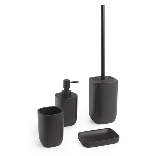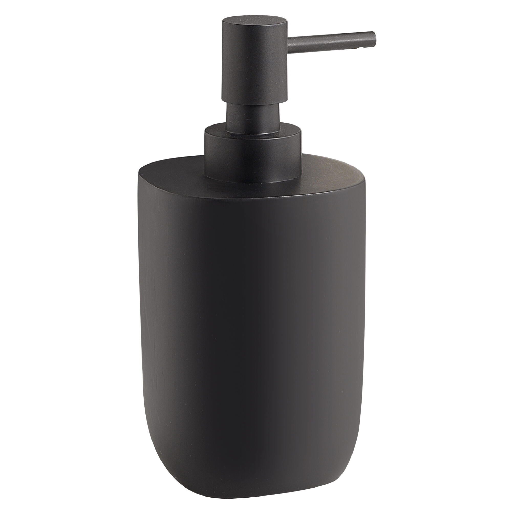 Dosificador de jabón de sobremesa de la serie YLENIA realizado en resina en acabado negro mate con válvula plástica, con capacidad de 310 ml.