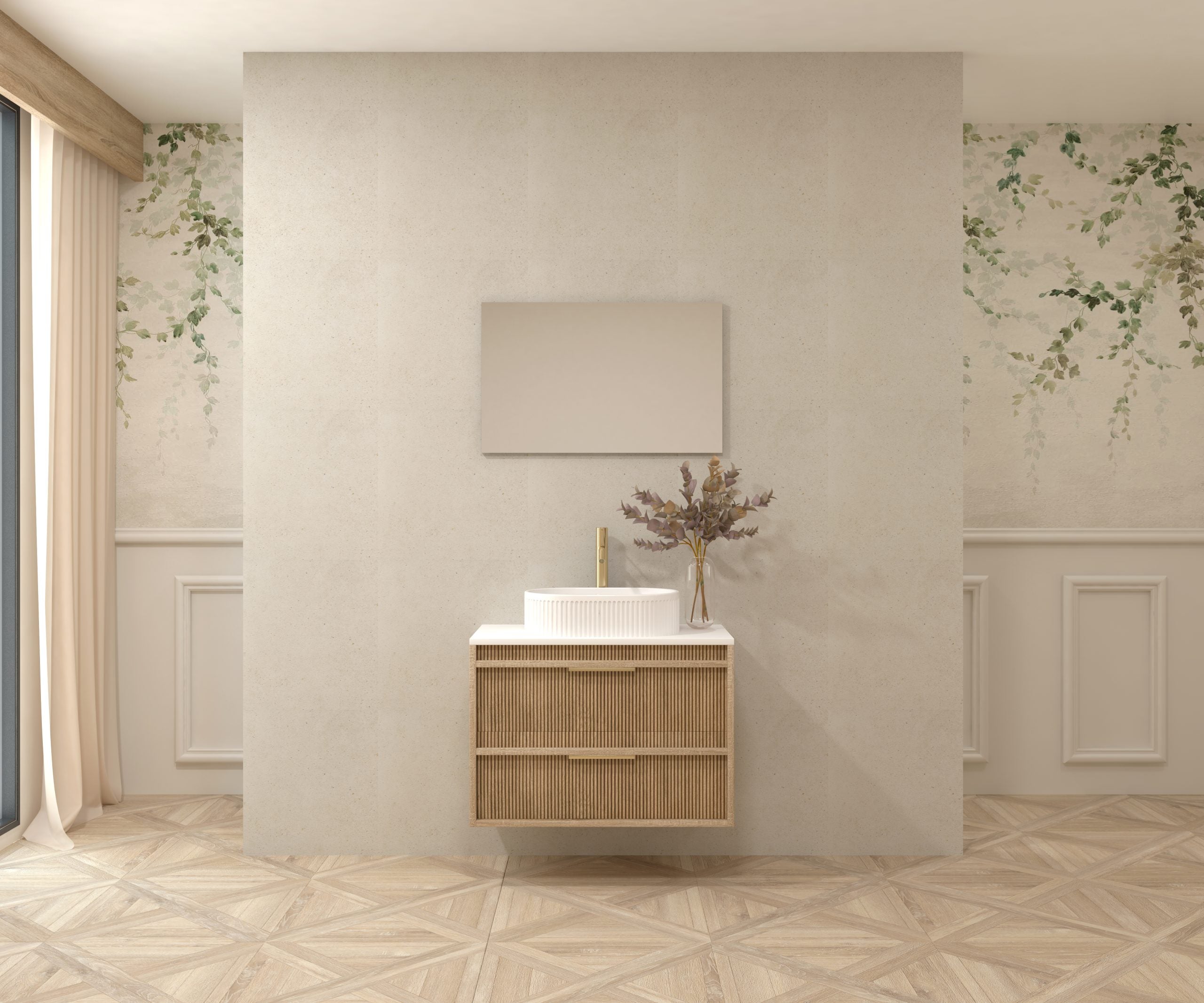 Más información Este enlace se abrirá en una nueva ventanaPack compuesto por mueble de baño suspendido y lavabo. Mueble formado por un módulo de dos cajones, con frentes efecto alistonado y apertura con tirador. Mueble fabricado en tablero de partículas de 19 mm con recubrimiento melamínico y características de superficie óptimas, ecológico y reciclable. Colgadores con sistema antidescolgamiento. Cajón metálico de doble pared de estética minimalista, de costillas finas y líneas rectas, cierre amortiguado, capacidad de carga de 25 kg, accesibilidad total y espacio trasero disponible. Incluye lavabo sobreencimera de cerámica. El mueble se sirve montado, preparado para colgar a la pared. Se incluye kit para la colocación del mueble. Espejo, grifo y sifón no incluidos. Fabricado en España.