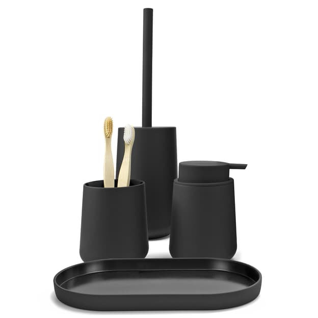 Escobillero para inodoro color negro mate de la serie Ada. Combinación perfecta de estilo y elegancia. Fabricado en plástico de gran resistencia con un diseño robusto y ergonómico. Su cepillo color disimula mucho mejor la suciedad. Este escobillero te ayudará a mantener limpio y desinfectado el interior del inodoro. Simplemente debes coger el mango y frotar con el cepillo la superficie que se desea limpiar. Esta escobilla de la serie Ada está disponible en tres colores: blanco mate, negro mate y arena mate. La serie completa está formada por el dosificador de jabón, el portacepillos y el escobillero para inodoro. Con la serie Ada darás a tu baño un toque sofisticado y original.