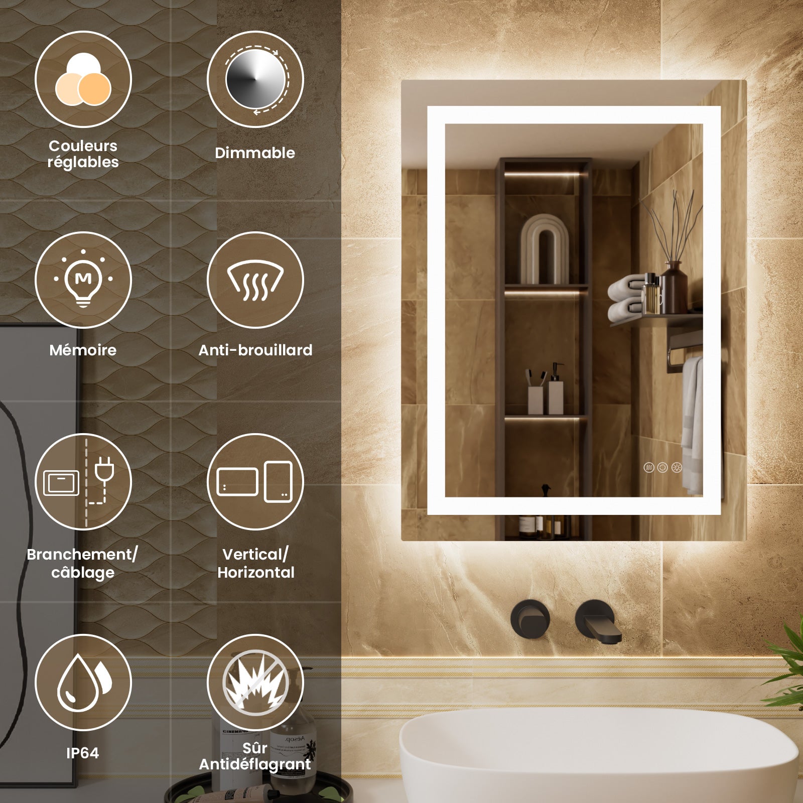 😉【Instalación flexible】Elija la orientación que mejor se adapte a su baño: horizontal o vertical. La instalación cableada le da al espejo una apariencia elegante y limpia. Se incluyen instrucciones y piezas para que la instalación del espejo sea muy sencilla.