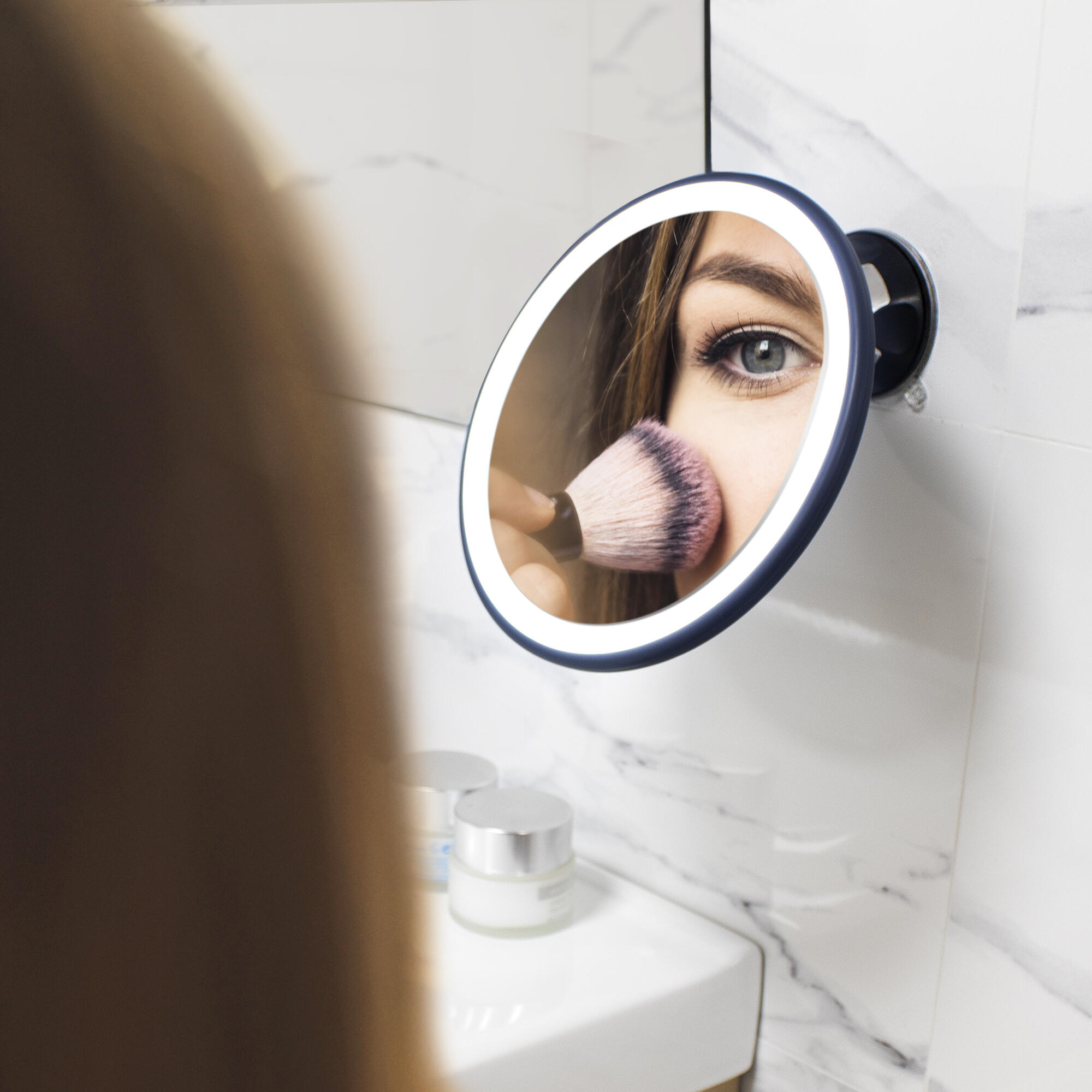 Espejo de aumento con ventosa de última generación. Cuenta con un anillo de iluminación LED de luz blanca. Puede mediante su batería de litio recargable o conectándolo directamente a la red eléctrica mediante un cargador de móvil (no incluido) y un cable USB tipo C (incluido de 1m). Su ventosa con una rótula de 360º permite orientarlo de la forma más cómoda. Debe fijarse sobre una superficie lisa no porosa (cerámica con acabado brillo, cristal, espejo, madera lacada brillo, etc). Cuenta con un aumento de 10X, 3 temperaturas de luz (blanca, intermedia y amarilla) botón táctil, sistema de auto-apagado (30min) e indicador de carga. Perfecto para realizar tareas de aseo minuciosas como depilar cejas, maquillaje o afeitado.