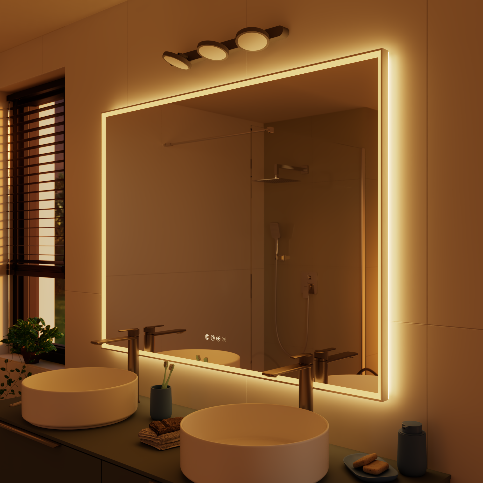 Publicado originalmente en Espejo de baño con luz LED ambiente, frontal, , New Frame negro con antivaho, táctil 120x90cm