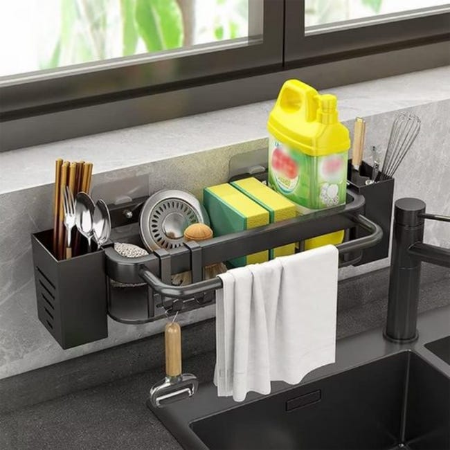 Más información Este enlace se abrirá en una nueva ventanaMateriales: Acero inoxidable de alta calidad con revestimiento protector, robusto y duradero, resistente a la corrosión, impermeable, fácil de limpiar y de secado rápido.Práctico: Cuenta con una barra para colgar toallas delante del organizador de fregadero, lo que facilita su secado. Los soportes extraíbles para palillos a cada lado sirven para palillos, cucharas, cuchillos y tenedores.Ahorra espacio: El organizador de fregadero no requiere taladrar para fijarlo a la pared y no ocupa espacio en la encimera, lo que facilita la limpieza y mantiene la mesa limpia.Fácil de instalar: El organizador de fregadero no requiere herramientas de montaje; simplemente fíjelo a la pared con un adhesivo fuerte y muy estable. Al retirarlo, no deja marcas ni daña la pared.Múltiples usos: El organizador de fregadero se puede usar en cocinas, baños, balcones, etc., para guardar y usar fácilmente artículos de tocador y utensilios de cocina. Especificaciones:Material: ABS, acero inoxidableColor: NegroTamaño: 30 x 13,5 x 6 cmEl producto incluye:1 organizador para fregadero2 soportes extraíbles para utensilios2 ganchos2 adhesivos fuertes2 tornillosNota:1. Espere 24 horas después de instalar los ganchos adhesivos.2. Puede haber algún error debido a la medición manual.3. Puede haber alguna diferencia de color debido a los monitores, las cámaras y otros factores.