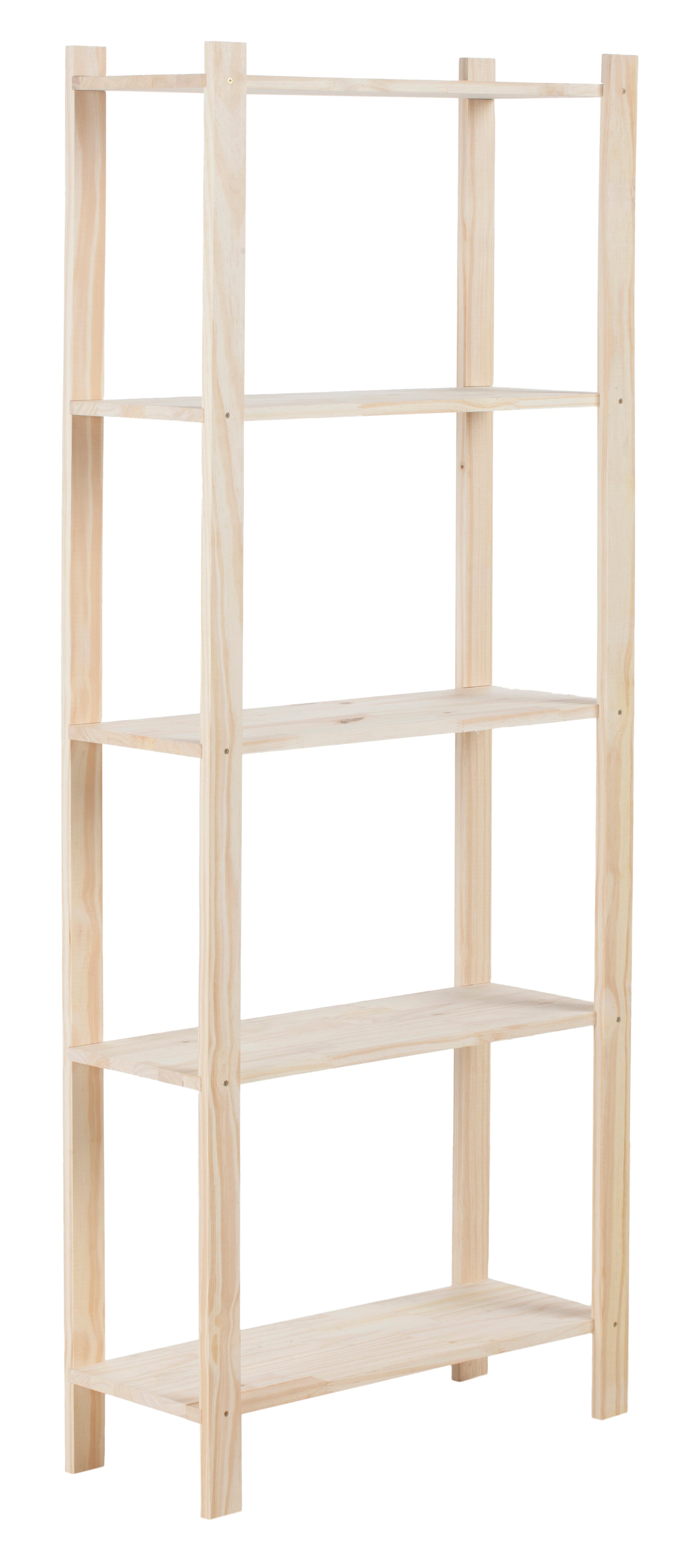 Estantería de madera de pino macizo natural con 5 baldas no alistonadas. Indicada para colocar en interior. Podrás personalizar el acabado de la estantería con barniz o pintura. Cada balda soporta 30 Kg. Medidas: 65 x 170 x 28 cm (ancho x alto x fondo).