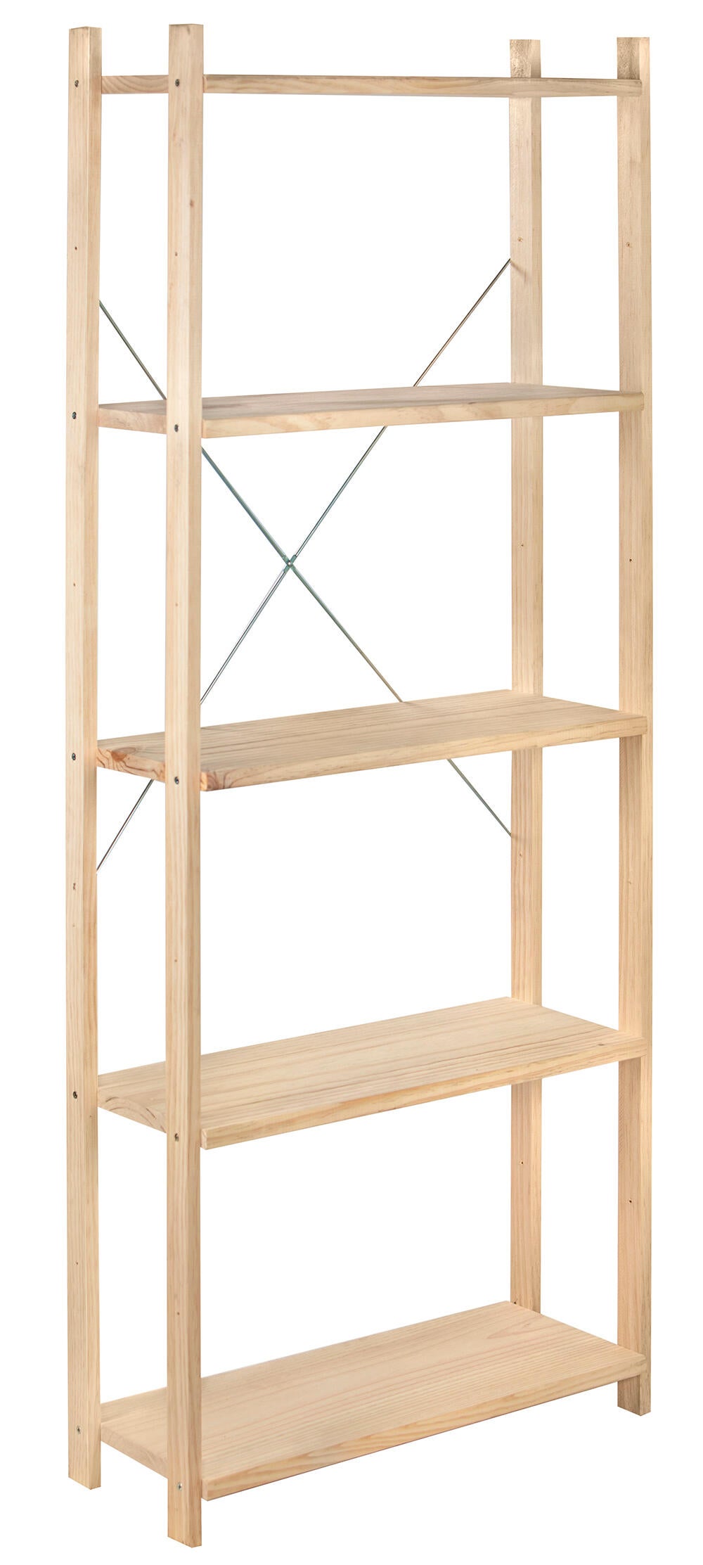 Estantes de madera maciza de pino y laterales abiertos. Así es esta estantería de 5 baldas regulables en altura. Cada estante, que tiene un grosor de 22mm, soporta hasta 50 kg de peso. Contiene una aspa trasera que garantiza una perfecta estabilidad.De ti depende el espacio en el que la quieras ubicar porque encaja igual en un trastero o despensa que en cualquier estancia de tu casa. Su acabado en madera natural es perfecta para pintarla o barnizarla.Resolverás todas tus necesidades de almacenaje y tendrás todo a la vista y al alcance de la mano: libros, plantas, espejos, marcos, objetos decorativos... No solamente se trata de guardar cosas sino también de crear un expositor decorativo.