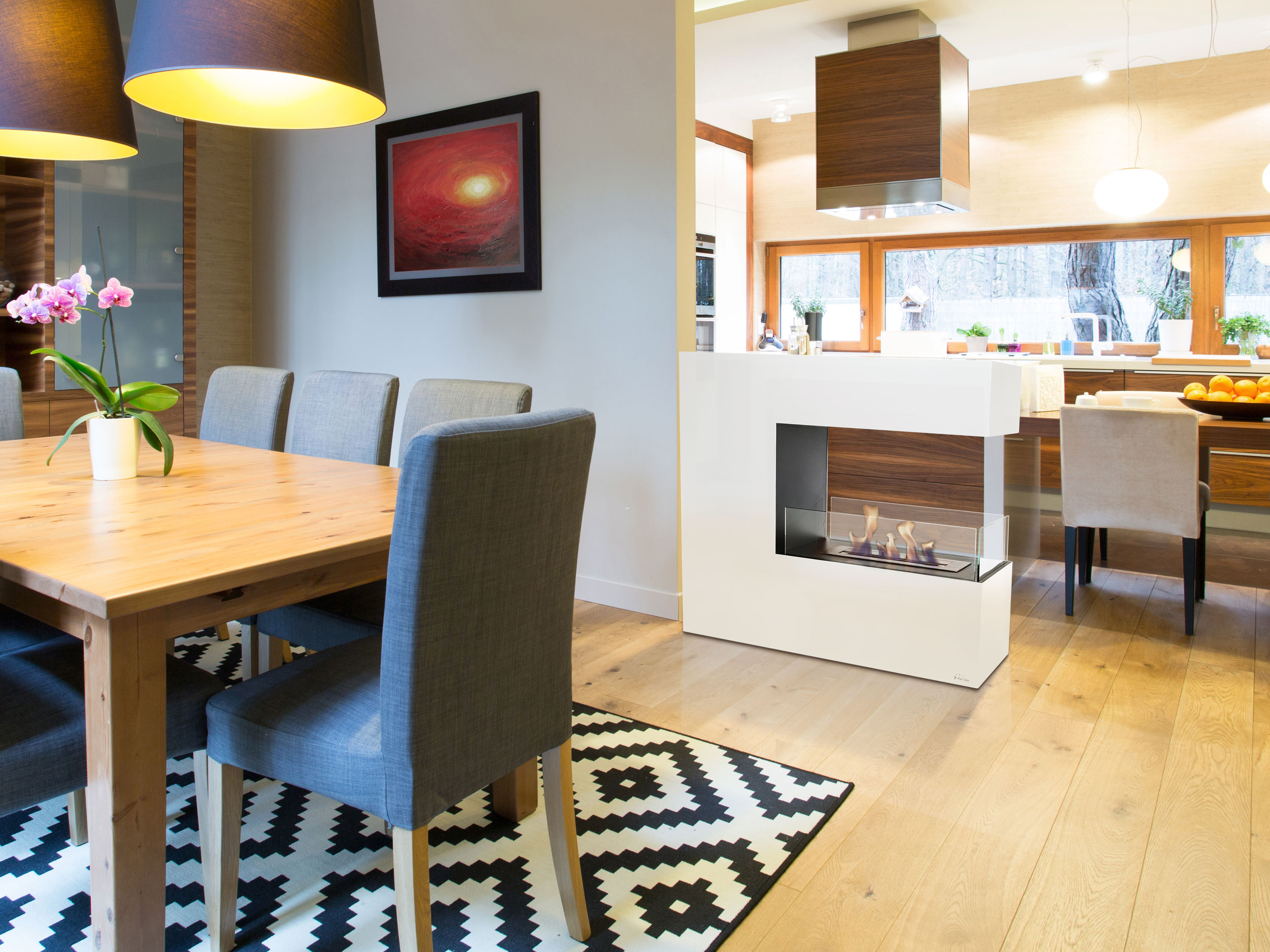 Estufa de bioetanol Purline Niobe, de suelo de gran formato con cuerpo de acero lacado en blanco y 3 cristales de vidrio templado. Posee un depósito con capacidad de 2,2 litros y altura de llama regulable. Medidas: 100 x 90 x 35 cm (ancho x alto x fondo).