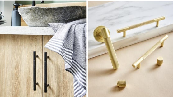 Los pomos y tiradores Axel están texturizados. Se pueden instalar horizontal o verticalmente para adaptarse a un cajón ancho o a la puerta de un armario grande. Para un cajón o una puerta más pequeños, el pomo a juego será discreto.