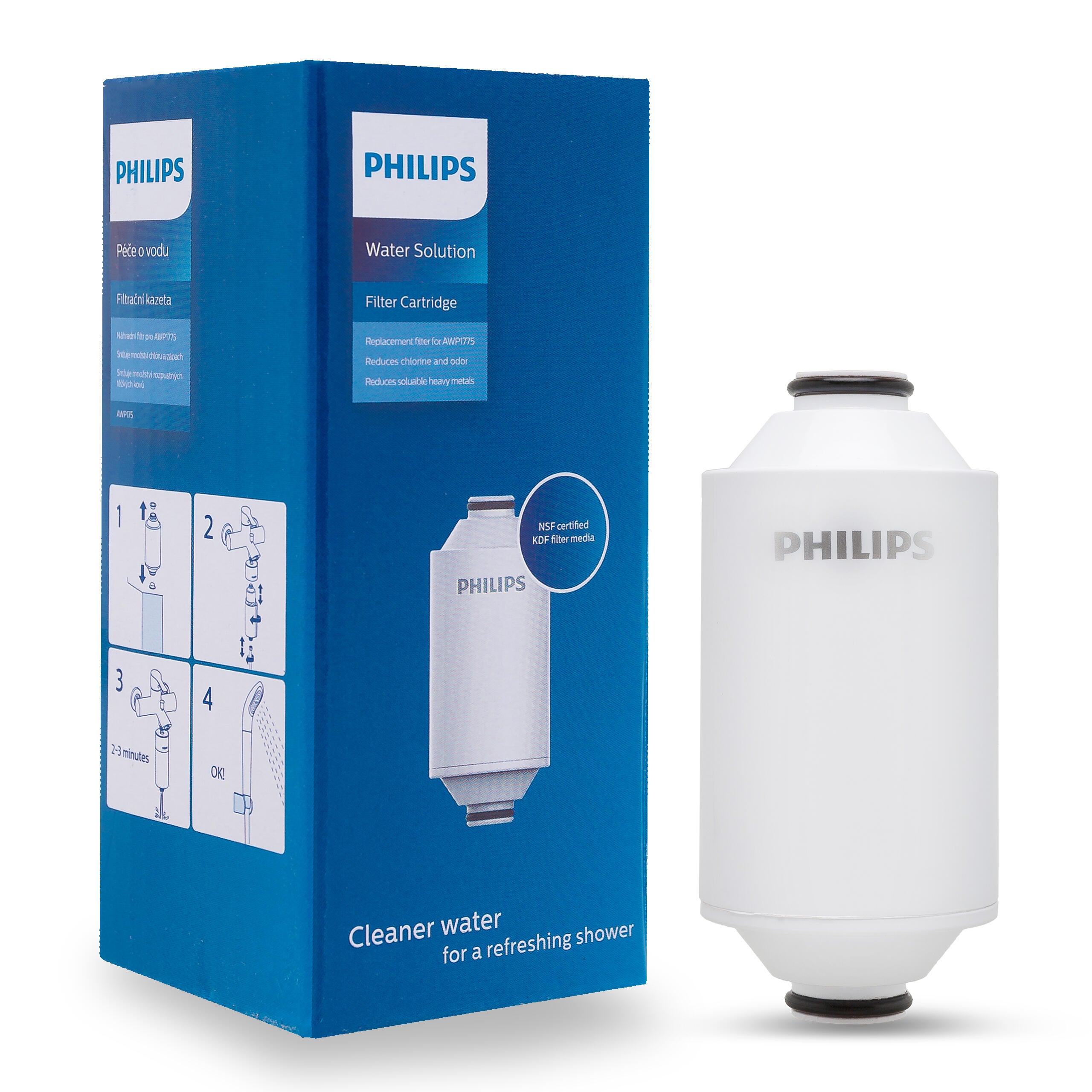 Cartucho de repuesto para Philips modelo AWP1775. Se trata de un filtro de agua para ducha purificador que elimina el cloro residual y las impurezas. El filtro fabricado con KDF con certificación NSF puede reducir hasta un 99% del cloro residual, así como el óxido, los sedimentos y otras impurezas; todo para que disfrutes de una ducha cómoda y refrescante con agua más limpia. Ayuda a mejorar las condiciones de la piel: reduciendo el cloro se puede reducir los eccemas. Ofrece un alto flujo de agua: 8 litros por minuto para disfrutar de una experiencia agradable en la ducha. Incorpora material antiquemaduras: la carcasa está fabricada con material antiquemaduras que se adapta totalmente a la temperatura del agua caliente de los calentadores de agua convencionales, garantizando así un uso seguro. Filtro de gran duración: 50.000 litros. Cartucho de sustitución: AWP175.