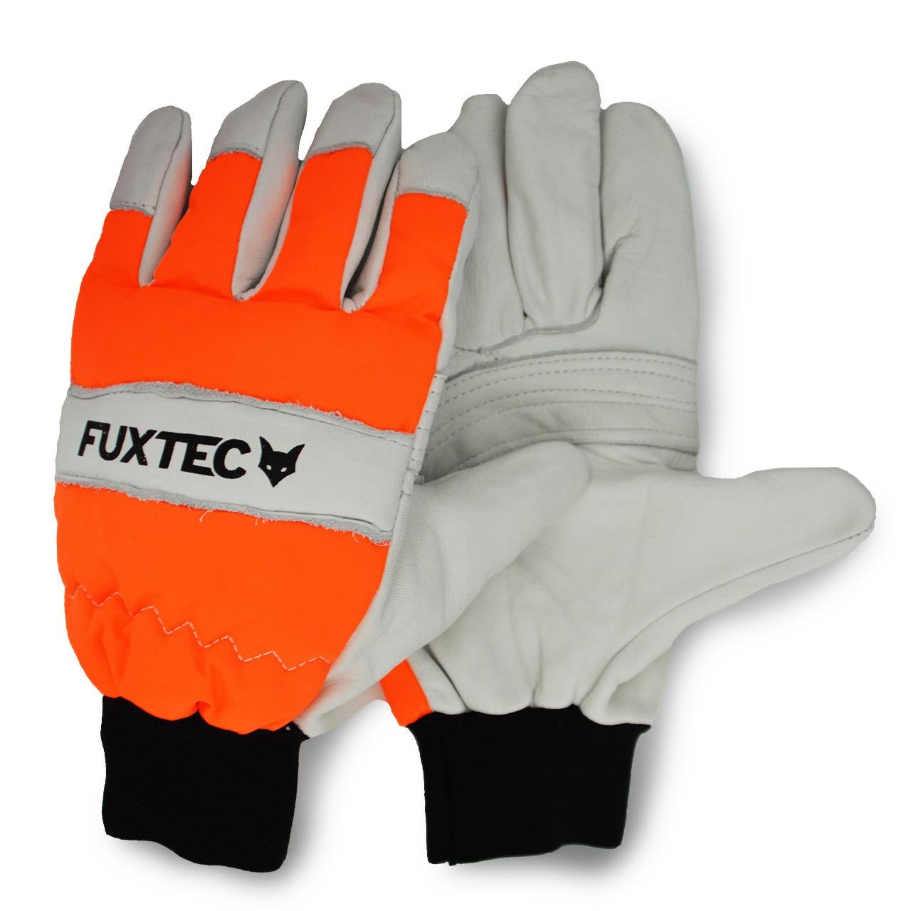 Guantes anticorte XL/11 FUXTEC, conformes a la norma EN 381-7 Cl.0 (16 m/s). Ideales para trabajos de corte con motosierras, divisores y sierras. Inserciones confortables y resistentes a los cortes, piel de vacuno, protección de punto negro en la muñeca, dorso de seda naranja. Adecuado para el manejo de máquinas en el bosque y para uso privado.