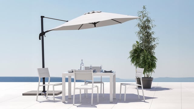 Pon un toque contemporáneo y un amplio espacio de sombra en tu jardín, con un parasol de grandes dimensiones y máxima estabilidad. Su mástil de aluminio es resistente al óxido y la intemperie; y su gruesa lona de 200 g/m2 te asegura una buena protección frente al sol. Además, lo puedes limpiar fácilmente con un paño húmedo y jabón neutro, para disfrutarlo siempre como el primer día.
