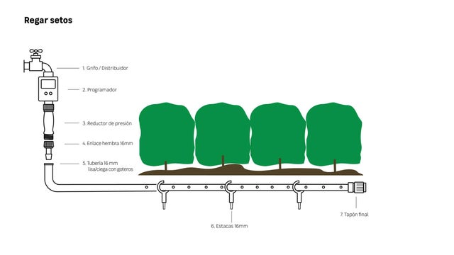 Aquí tienes un resumen de las piezas básicas que necesitarás para montar un riego por goteo para tus setos: un grifo de 2 salidas, un programador, un reductor de presión, un adaptador de 3/4 a 16 mm, tubería de polietileno de 16 mm , tubería de polietileno de 16 mm con goteros incorporados, uniones para tubería de 16 mm, estacas para sujetar tubería de 16 mm, y tapones para tubería de 16 mm.