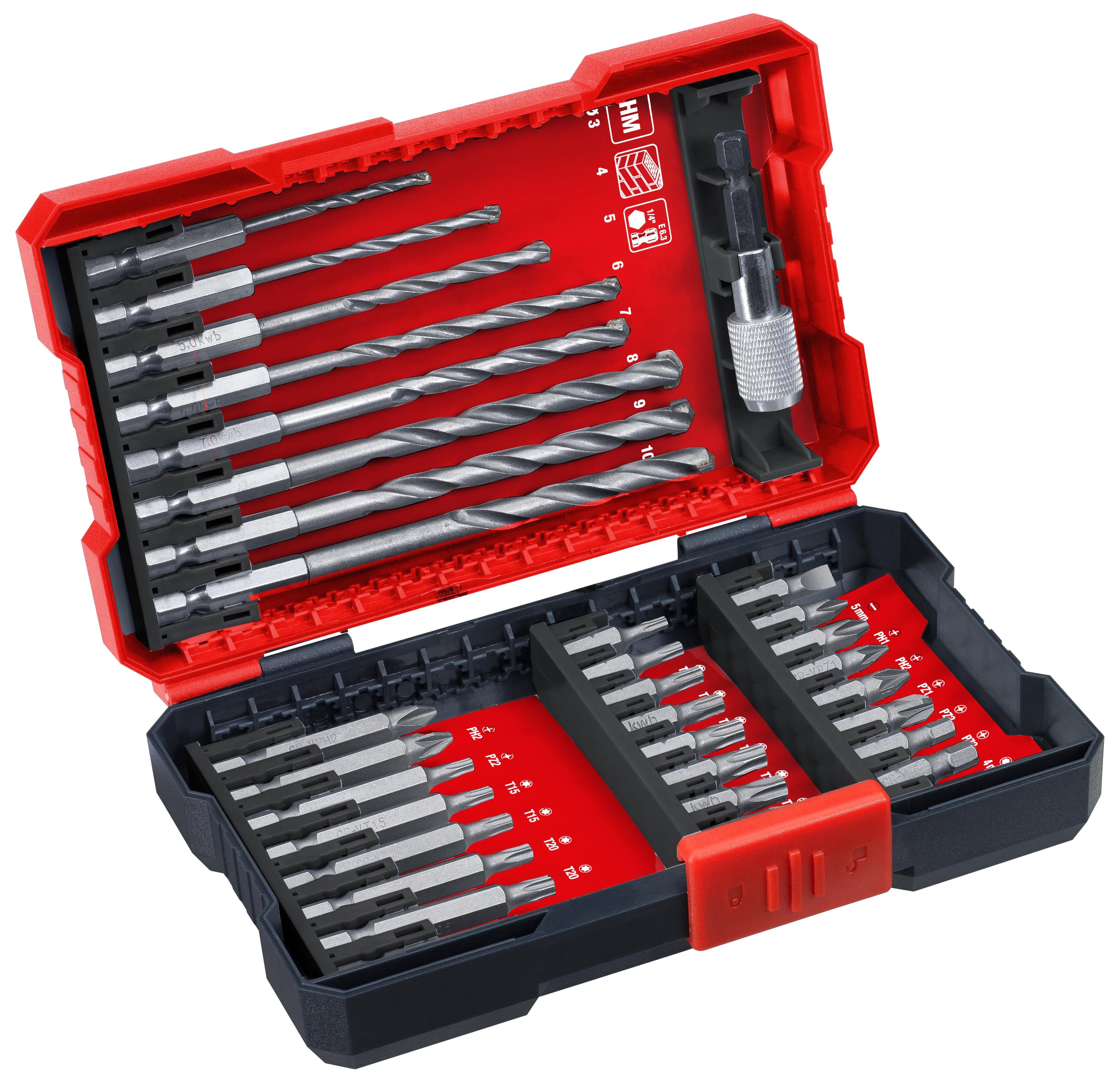 Caja de puntas y brocas de 33 piezas, con 24 puntas en los tamaños y formas más comunes: 16 puntas de 25 mm y 8 de 50 mm de longitud, además de 8 brocas para piedra y 1 portapuntas de cambio rápido; descripción de las puntas de 25 mm: plana 5.0 mm, PH 1, PH2, PZ 1, PZ 2 y PZ 3, Hex 4, 5 mm, T 10, 15, 20, 25, 27, 30 y 40 con vástago C6.3; descripción de las puntas de 50 mm: PH 2, PZ 2, T 15, 20 y 25, para llegar también a los tornillos más profundos, con vástago E6.3; las formas más utilizadas de las puntas están presentes en varias unidades; todas las puntas están fabricadas en CR-V; brocas para piedra de 3, 4, 5, 6, 7, 8, 9 y 10 mm de diámetro fabricadas en acero HSS, con puntas de metal duro y vástago de E 6.3; todas las puntas y brocas son compatibles con atornilladores y taladores comunes.
