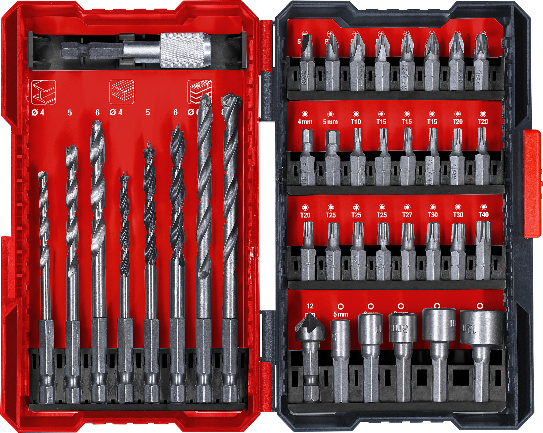 Juego combinado de puntas y brocas, 39 piezas: contiene 24 puntas de 25 mm de largo en las formas más comunes, 3 brocas HSS para metal, 3 brocas para madera, 2 brocas HM para piedra, 5 llaves de vaso, 1 avellanador, 1 portapuntas de cambio rápido; descripción de las puntas: 5,0 mm, PH 1, PH 2, PZ 1, PZ 2, PZ 3, hex 4, 5 mm; T 10, 15, 20, 25, 27, 30 y 40; las formas más comunes cuentan con varias unidades; material de las puntas CR-V, todas las puntas con vástago C6,3; brocas para metal de 4, 5 y 6 mm de diámetro con ángulo de punta de 118° de HSS con vástago E6,3; brocas para piedra de 6 y 8 mm de diámetro con punta de HM y vástago E6,3; brocas para madera de 4, 5 y 6 mm de diámetro con filo de 3 puntas y vástago E6,3; llaves de vaso para apretar tuercas, avellanador para enrasar tornillos, todas las puntas y brocas son compatibles con taladros y atornilladores comunes.