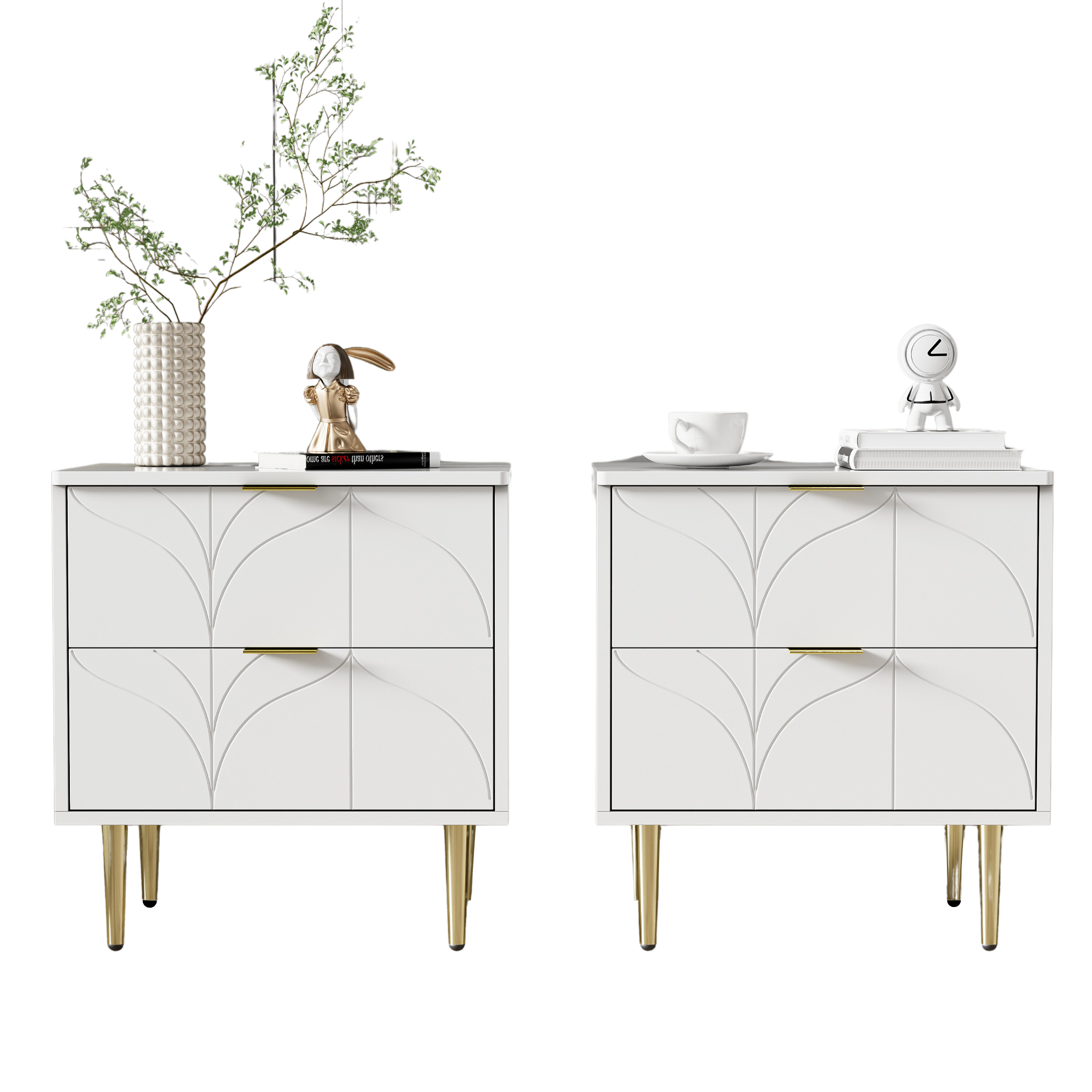 Juego de 2 Mesitas de Noche Modernas - Blanco con Detalles Dorados y Estampado Floral