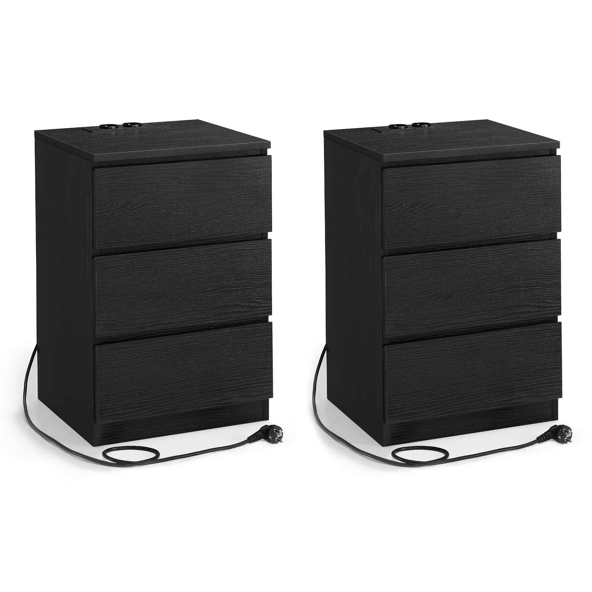 Juego de 2 mesitas de noche modernas con estación de carga - 3 cajones, 2 tomas de corriente, 2 puertos usb, ideal para dormitorio, negro ébano