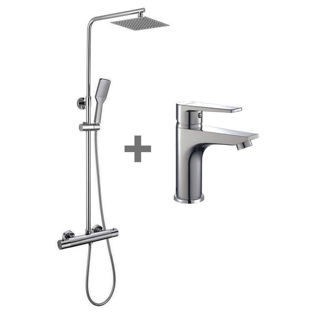 Más información Este enlace se abrirá en una nueva ventanaColumna de ducha termostática con diseño elegante, tiene un tubo extensible de 80 a 120 cm. no tendrás ningún problema para instalar tu nueva columna de ducha, no obstante, sabes que puedes contactar con nuestro servicio de atención al cliente para cualquier duda o consulta. te garantizamos la disponibilidad de todos los repuestos originales si puedes reparar, por qué vas a tirar? Características destacables: Sistema de columna termostático dará un diseño más exclusivo a su cuarto de baño. Es muy fácil de limpiar y mantener en perfecto estado. Duchón rociador de 20x20 cm, con caida de agua efecto lluvia para una relajante ducha. Ducha de mano con 1 modo de chorro de agua: salida suave. Además, la ducha de mano y el rociador superior de ducha disponen de un sistema antical integrado, que le facilitará la limpieza y evitará la calcificación rápida en zonas con aguas más calcáreas. Columna con tubo redondo muy resistente fabricado en latón. Flexo de ducha de acero inoxidable con acabado en cromo brillo, con gran resistencia ante torceruras o nudos y tiene una protección contra las quemaduras por el paso del agua caliente. El pack columna incluye: Grifo termostático fabricado en latón macizo con caño inferior, Flexo de acero inoxidable cromado, Maneral ABS cuadrado de 1 posición con sistema antical, Tubo redondo de 22mm extensible de 80cm hasta 120cm de latón, Rociador / Duchón superior cuadrado de 20x20cm. Soporte deslizante para mango de ducha fabricado en ABS, Embellecedores y excéntricas para el grifo, Soportes de pared para sujección del tubo. El pack grifo lavabo incluye: Grifo monomando fabricado en latón, Latiguillos de conexión de acero inoxidable cromado, Herrajes y tornillos de instalación, Cartucho de monomando de 40mm, Juntas de estanqueidad.