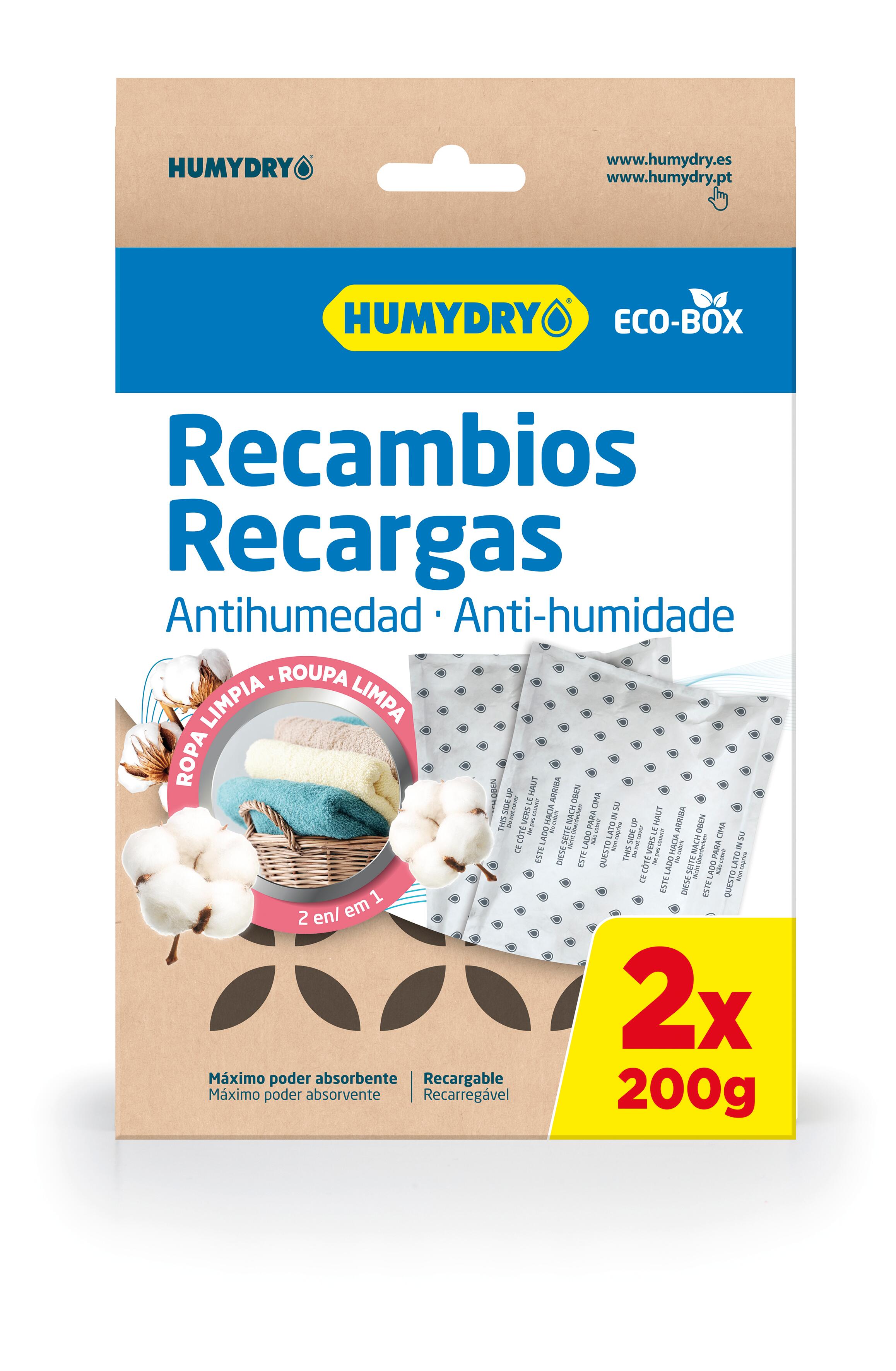 Kit de absorción de humedad HUMYDRY 400 gr para uso en estancia hasta 8m2. Perfume floral. 2 recargas en bolsa. 4.5 x 19 x 14.5 cm. Vida útil 12 semanas.