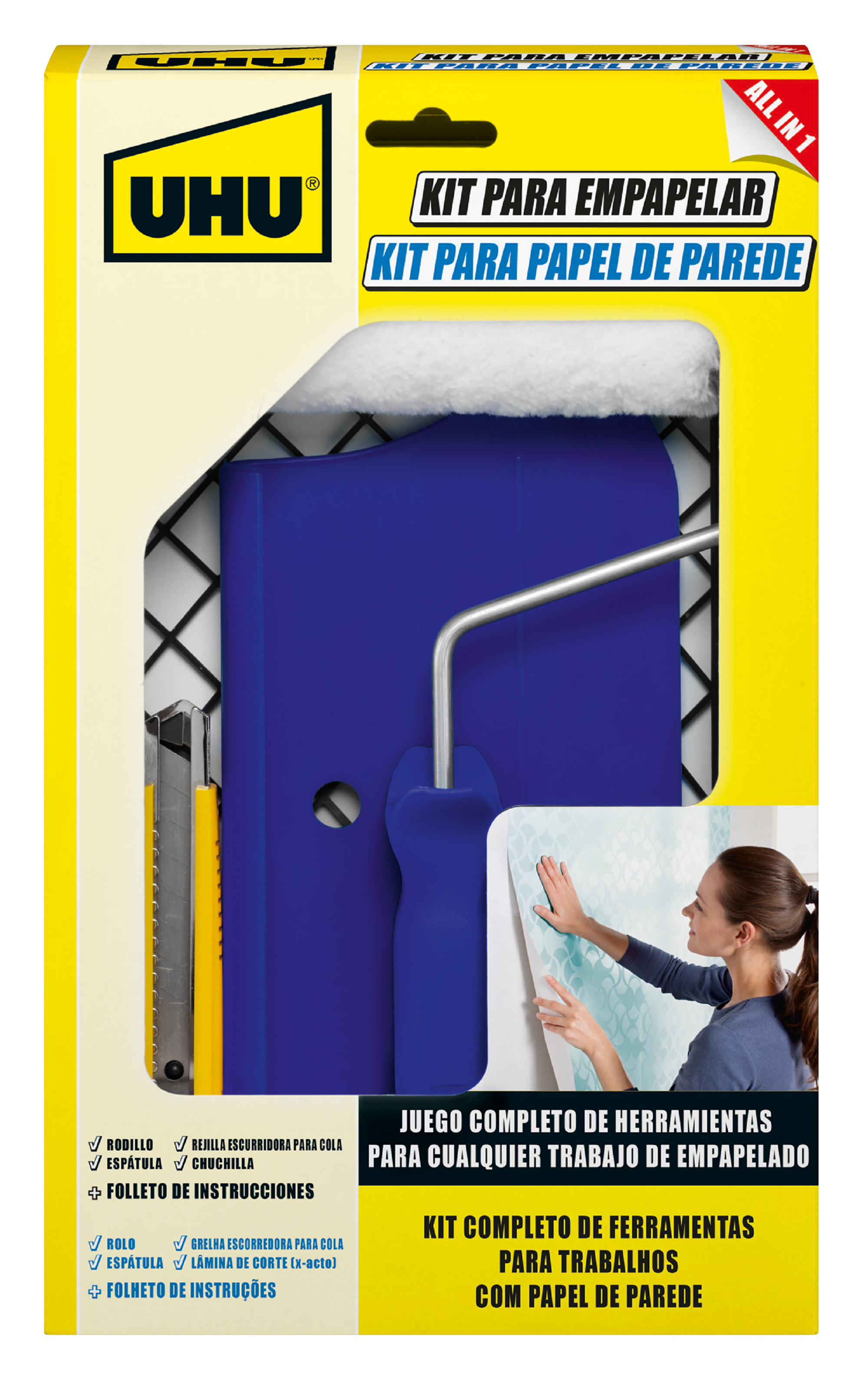 Kit completo de herramientas para cualquier trabajo de empapelado. Con este kit tienes todo lo necesario para decorar las paredes de tu hogar con el papel que más te guste. Incluye rodillo, rejilla escurridora para cola, espátula, cúter y folleto con instrucciones.