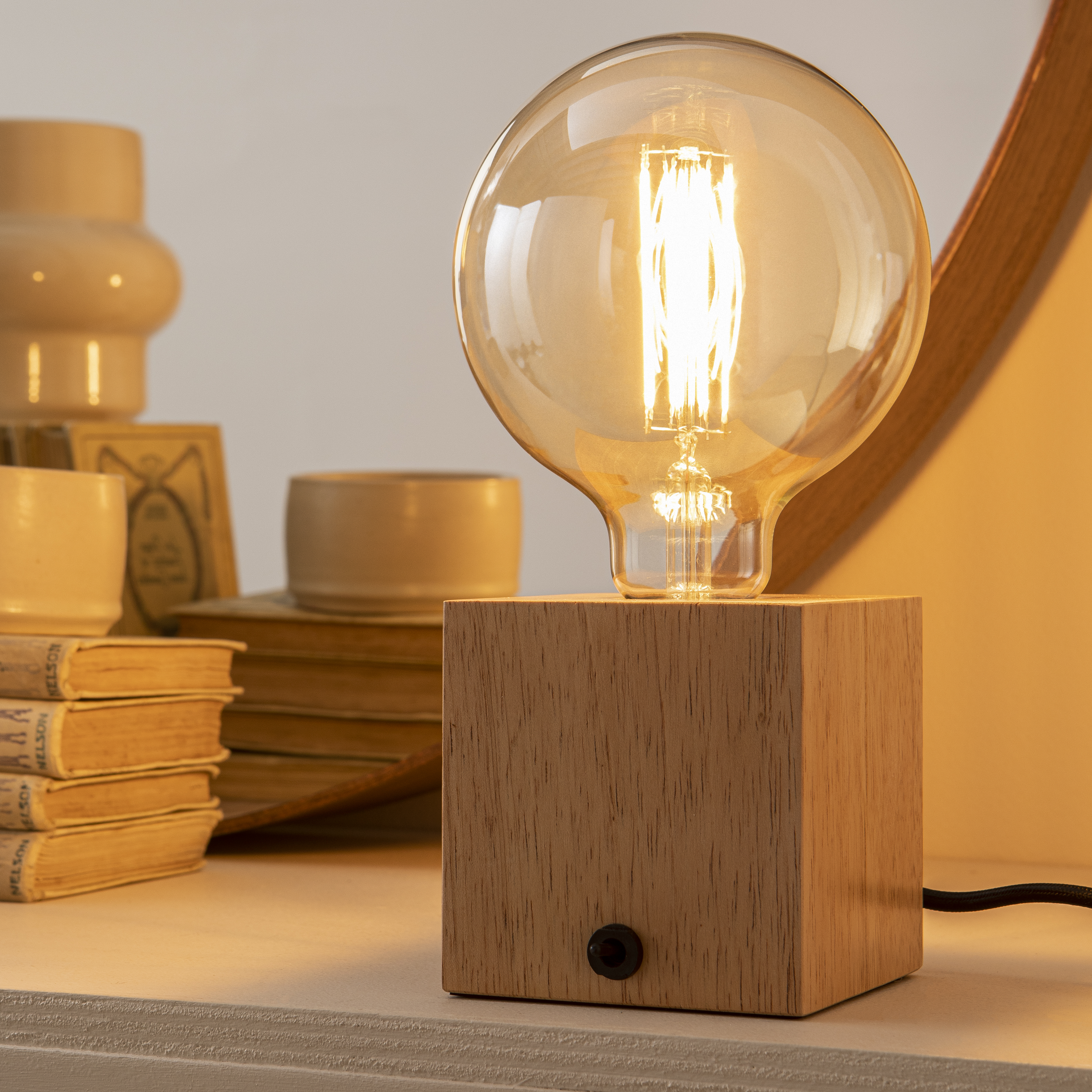 Lámpara de mesa Inspire Booken. Con su aspecto crudo y líneas limpias encajará perfectamente en cualquier dormitorio, oficina o salón moderno. Añade un toque de naturaleza a tu interior gracias a su base de madera, procedente de bosques gestionados de forma responsable y certificada con el sello FSC. Puede personalizar el estilo y la iluminación eligiendo una bombilla de la gama de bombillas Lexman deco. Elige, por ejemplo, una bombilla de filamentos ámbar para acentuar el carácter de tu lámpara. Puedes encenderla y apagarla gracias a su elegante interruptor en la parte delantera de la lámpara. Ofrece 5 años de garantía.
