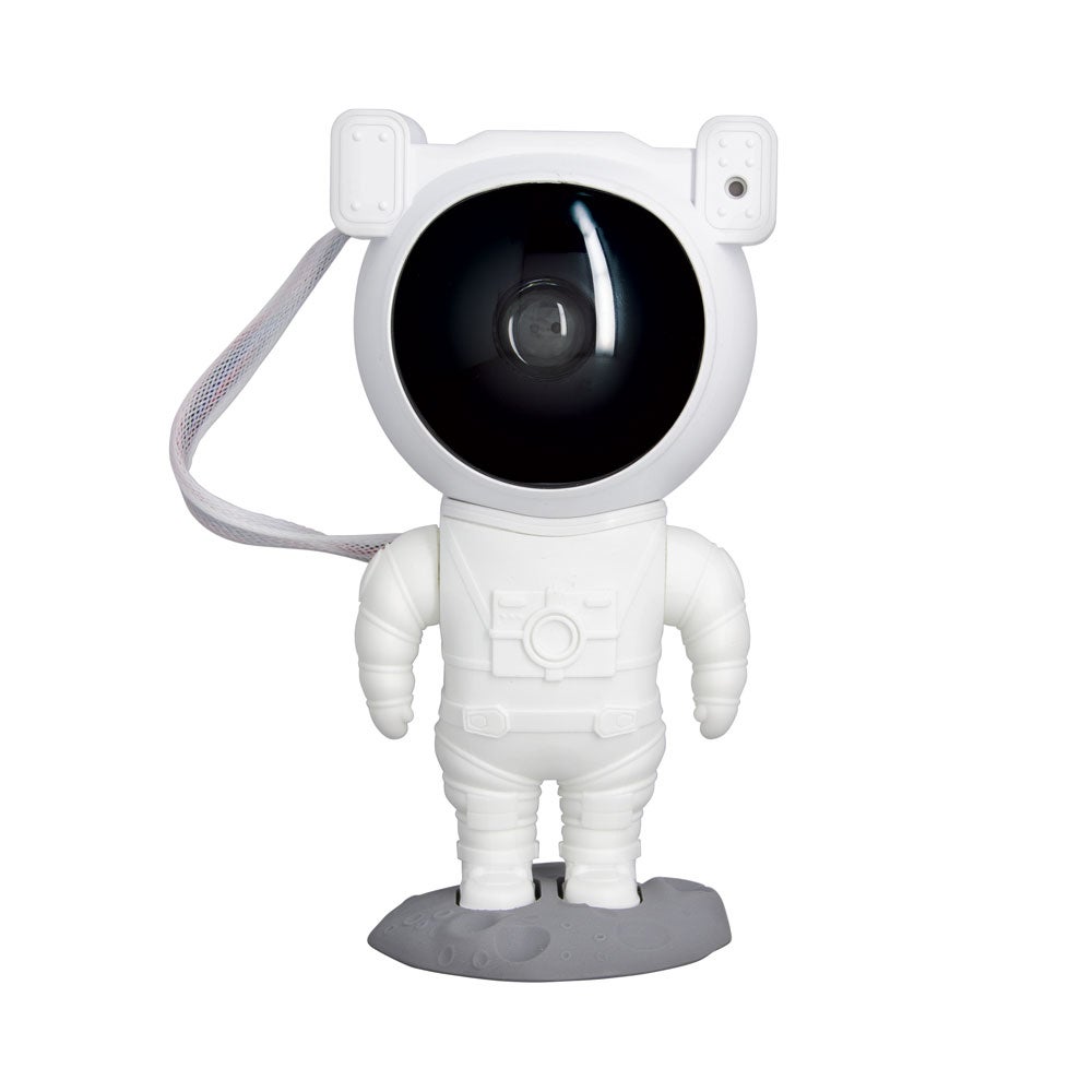 Proyector de estrellas fabricado en ABS blanco con forma de astronauta. Ofrece una amplia variedad de combinaciones de colores. La cabeza del astronauta puede girar 360 grados con atracción magnética, lo que permite proyectar la niebla en cualquier lugar sin restricciones. Excelente regalo para niños e ideal para salas de juegos, noches de cine y fiestas.