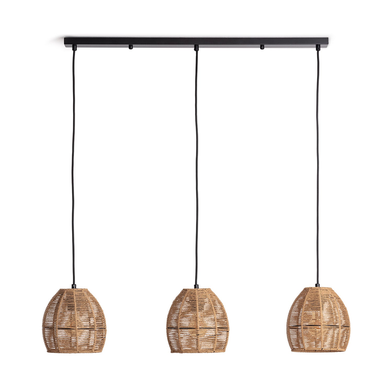 Características de la Lámpara Colgante Papel Trenzado Mahali 3 FocosLos materiales utilizados para la fabricación de esta lámpara hacen que sea ligera y resistente. El papel trenzado, aunque no lo parezca, cuando lo trabajas de esta manera, ofrece unas calidades óptimas en resistencia y flexibilidad, presentando una gran resistencia al impacto.
