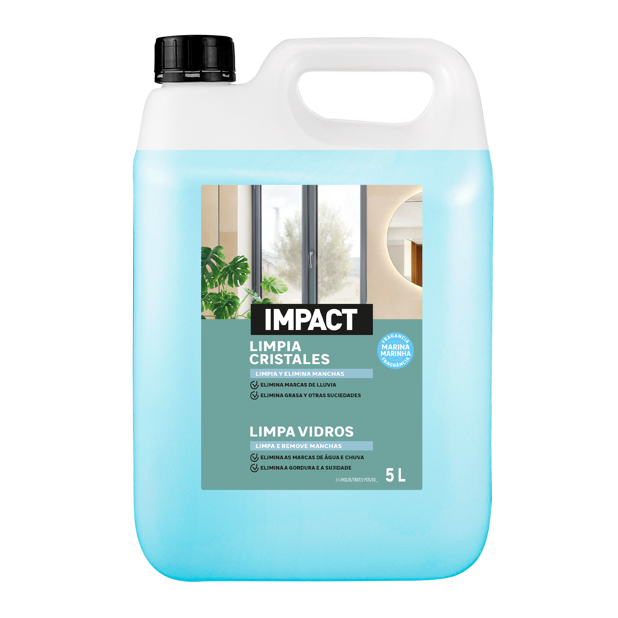 Limpiacristales y espejos Impact de 5L que devuelve el brillo, lustre y luminosidad a sus azulejos. Difunde un agradable aroma marino y no deja rastro.