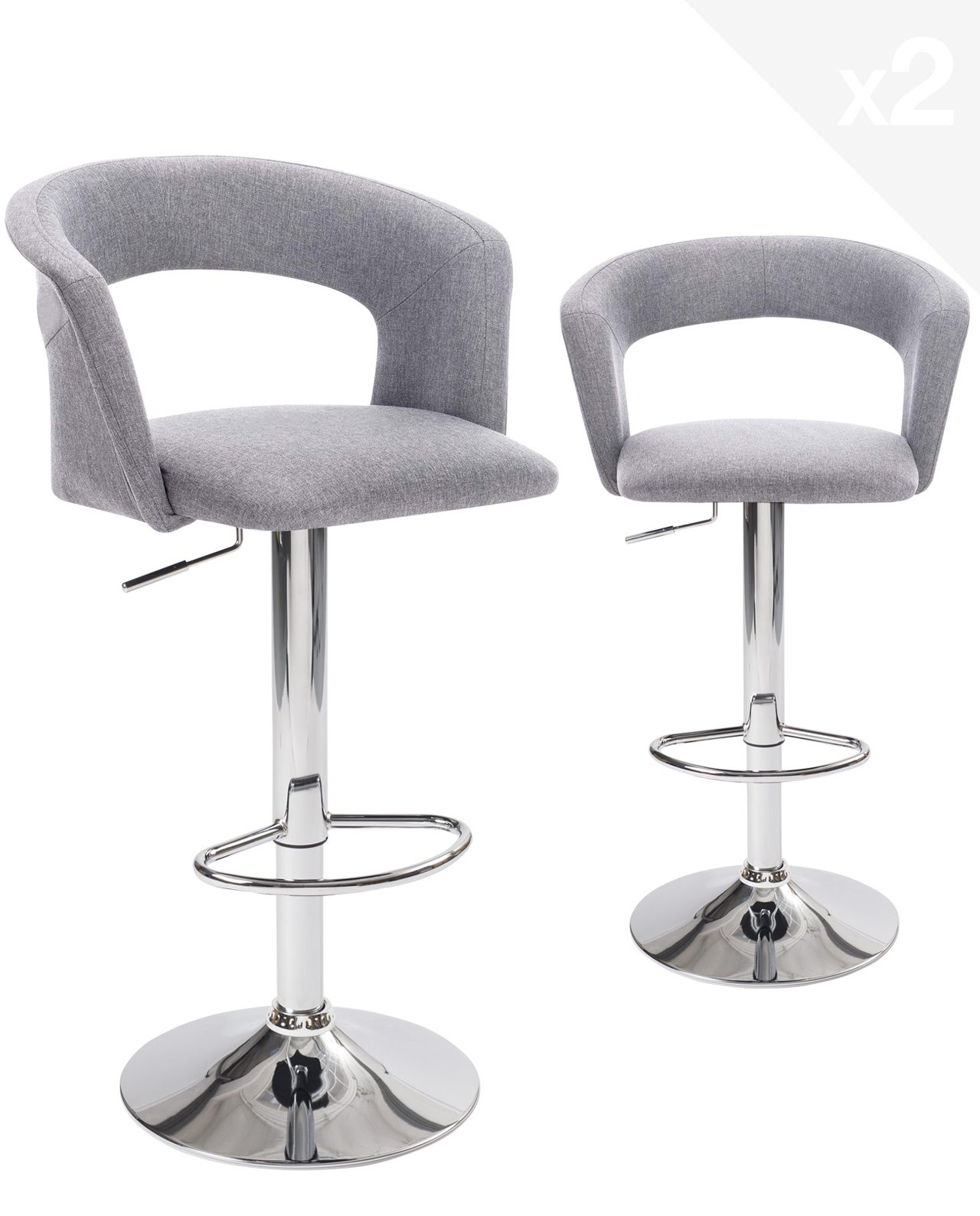 Lote de 2 taburetes de bar de diseño, asiento de tela acolchada con respaldo y reposabrazos, giratorio y altura regulable, base cromada AYO (gris)