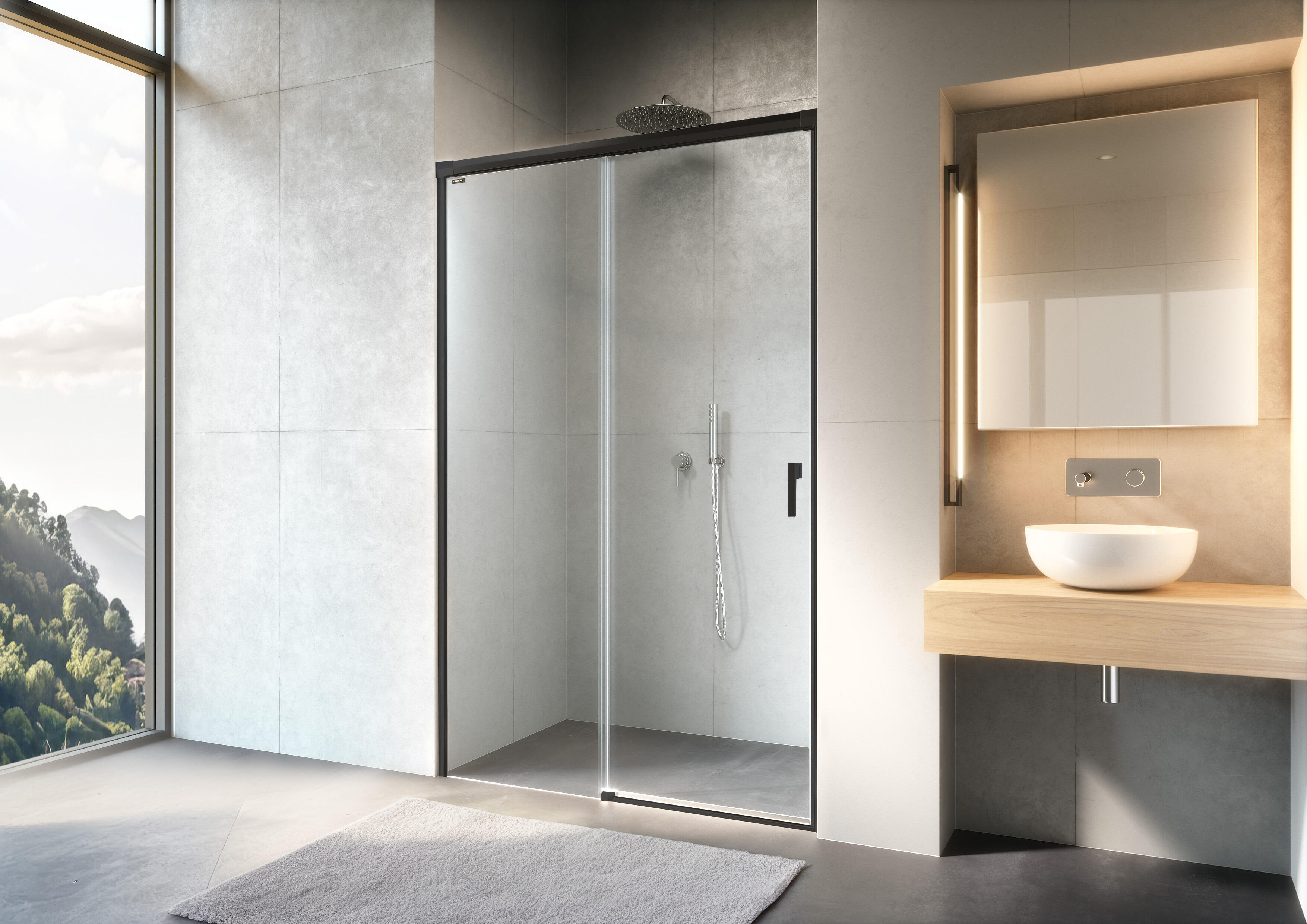Mampara de ducha corredera 1 hoja fija + 1 puerta corredera Prisma. Perfil aluminio negro. Ancho adaptable (115-120)x200 cm Cristal templado de seguridad transparente 6mm. Cierre magnético. Sin guía inferior Duscholux