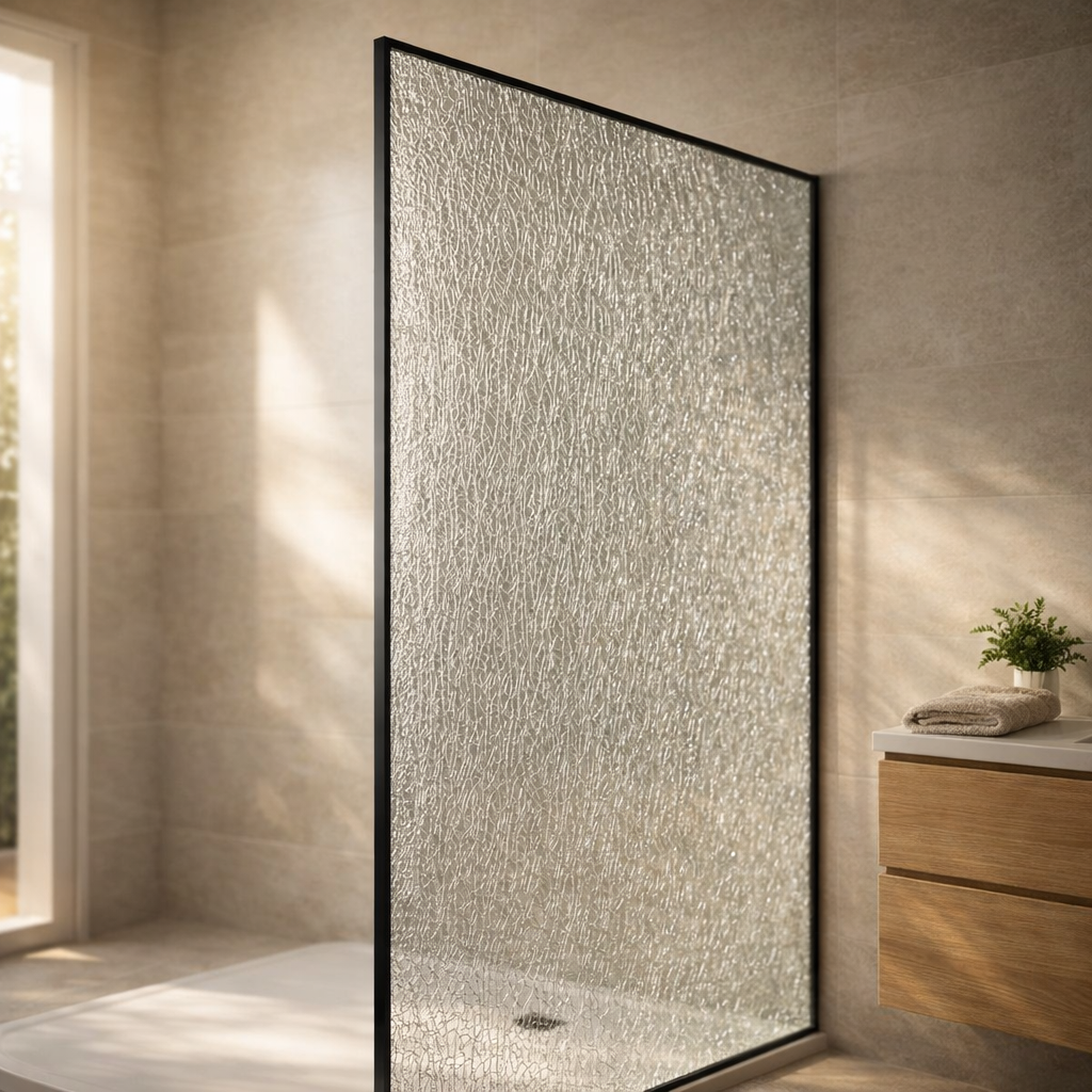 Mampara de ducha fija tipo WALK IN con un espectacular acabado decorativo efecto roto que aporta personalidad, privacidad y un estilo diferenciador al baño. Su diseño vanguardista convierte la zona de ducha en un elemento protagonista, ideal para baños modernos, industriales o de alta gama.