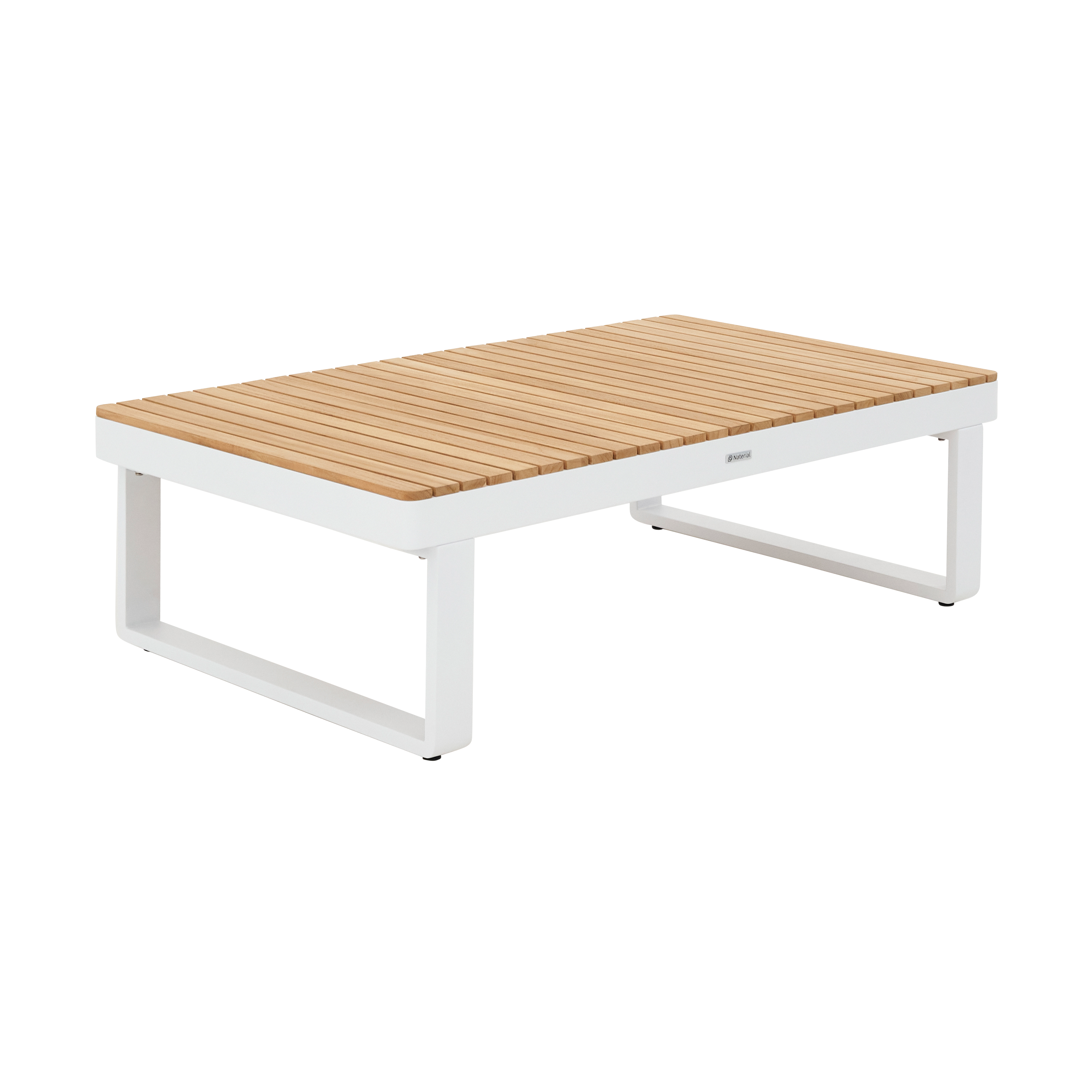 Mesa de centro para jardín Naterial con forma rectangular, estructura de aluminio en color blanco y tablero de teca en acabado natural. Indicada para 1 comensal, resulta ideal para disfrutar de todo tipo de comidas y refrigerios al aire libre. Este producto es reparable y tiene una garantía de 3 años; ponte en contacto con el servicio posventa de tu tienda para obtener más detalles. Tornillería suministrada. Medidas: 115 x 35,2 x 70 cm (ancho x alto x fondo).