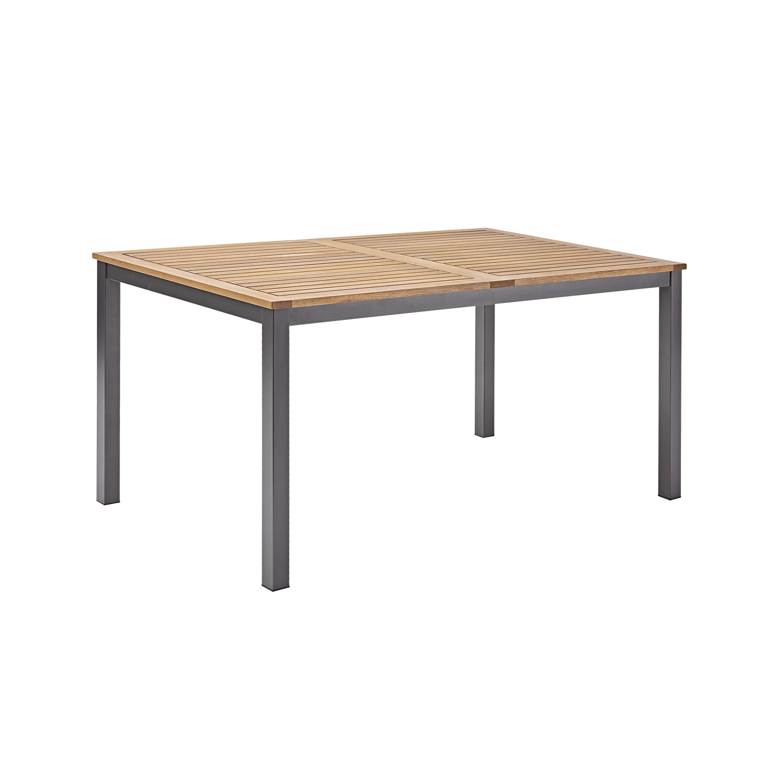 Mesa de comedor para jardín o terraza Naterial modelo Oris con capacidad para reunir hasta 6 comensales en el exterior de tu vivienda. Está fabricada en aluminio de color gris con tablero de madera maciza de eucalipto. Para su mantenimiento, se recomienda ubicarla bajo cubierta, protegida del sol directo, y guardarla en un lugar seco y ventilado cuando no la uses (o cubrir con una funda para muebles). Combina con el resto de elementos de la serie Oris pensados para jardín, terraza o patio, disponibles en Leroy Merlin. Cuenta con el sello FSC, que certifica que la madera proviene de bosques gestionados de manera sostenible y respetuosa con el medioambiente. Medidas: 150 x 74,6 x 89 cm (ancho x alto x fondo).