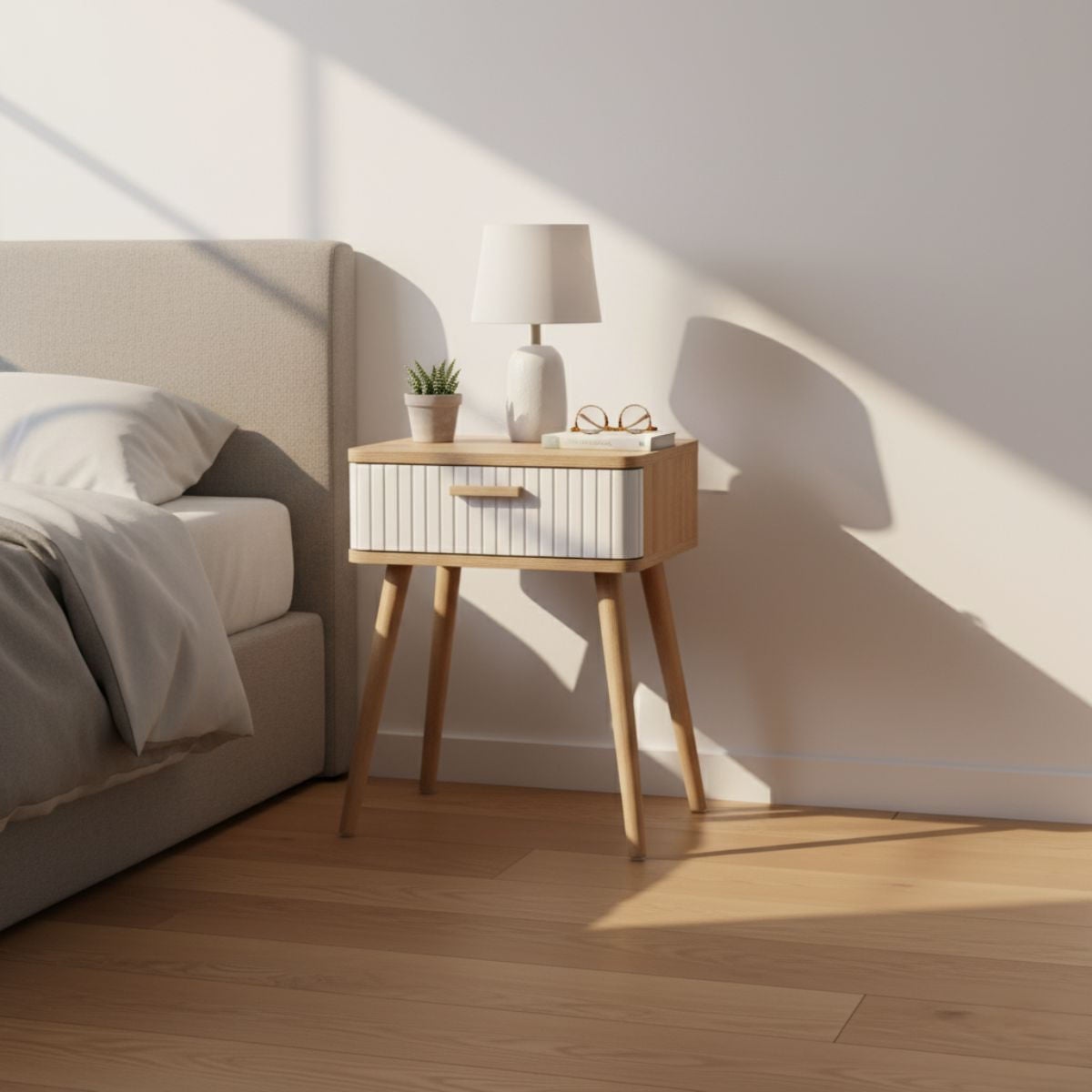 Mesilla de Noche Frisa de Dormitorio Estilo Nórdico en Color Blanco y Roble Nordish con 1 Cajón 40x52x30 cm