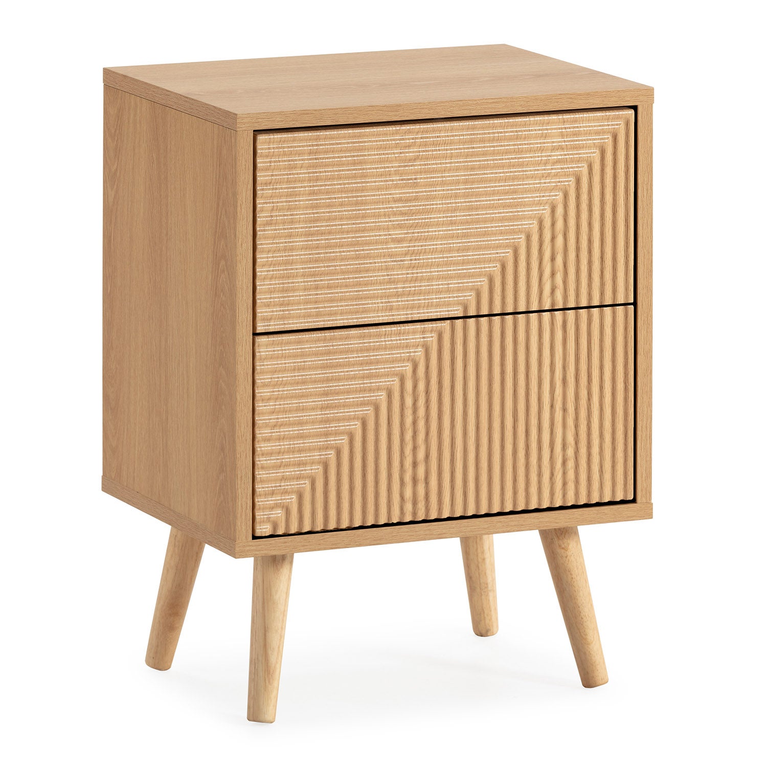 · Una característica por la que destaca la mesita de noche Telmo es el patrón rayado que ha sido estratégicamente diseñado para recrear un efecto óptico que resulta muy atractivo. Este diseño consiste en unas finas líneas dispuestas en sentido paralelo y en relieve que se distinguen en la parte frontal del mueble; unas líneas que forman una composición angular muy dinámica. Gracias a la dirección de estas líneas se percibe un juego de sombras que da una sensación tridimensional, un tipo de patrón propio de los motivos Art Decò contemporáneos, con un toque minimalista.