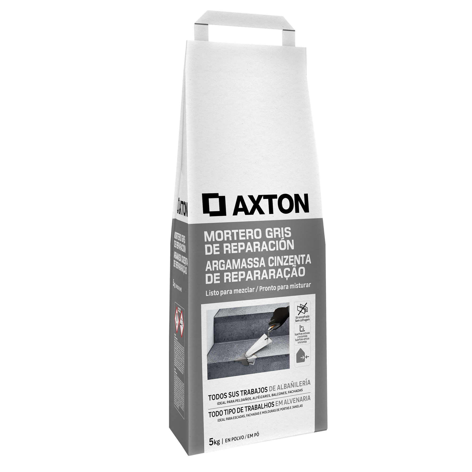 Mortero de reparación Axton de color gris y fraguado rápido, indicado para utilizar sobre paredes de mortero de hormigón tanto en interior como en exterior. Con él se podrán realizar capas de hasta 100 cm de grosor. El tiempo de secado completo es de 28 días. Fabricado en España. Contenido: 5 kg.