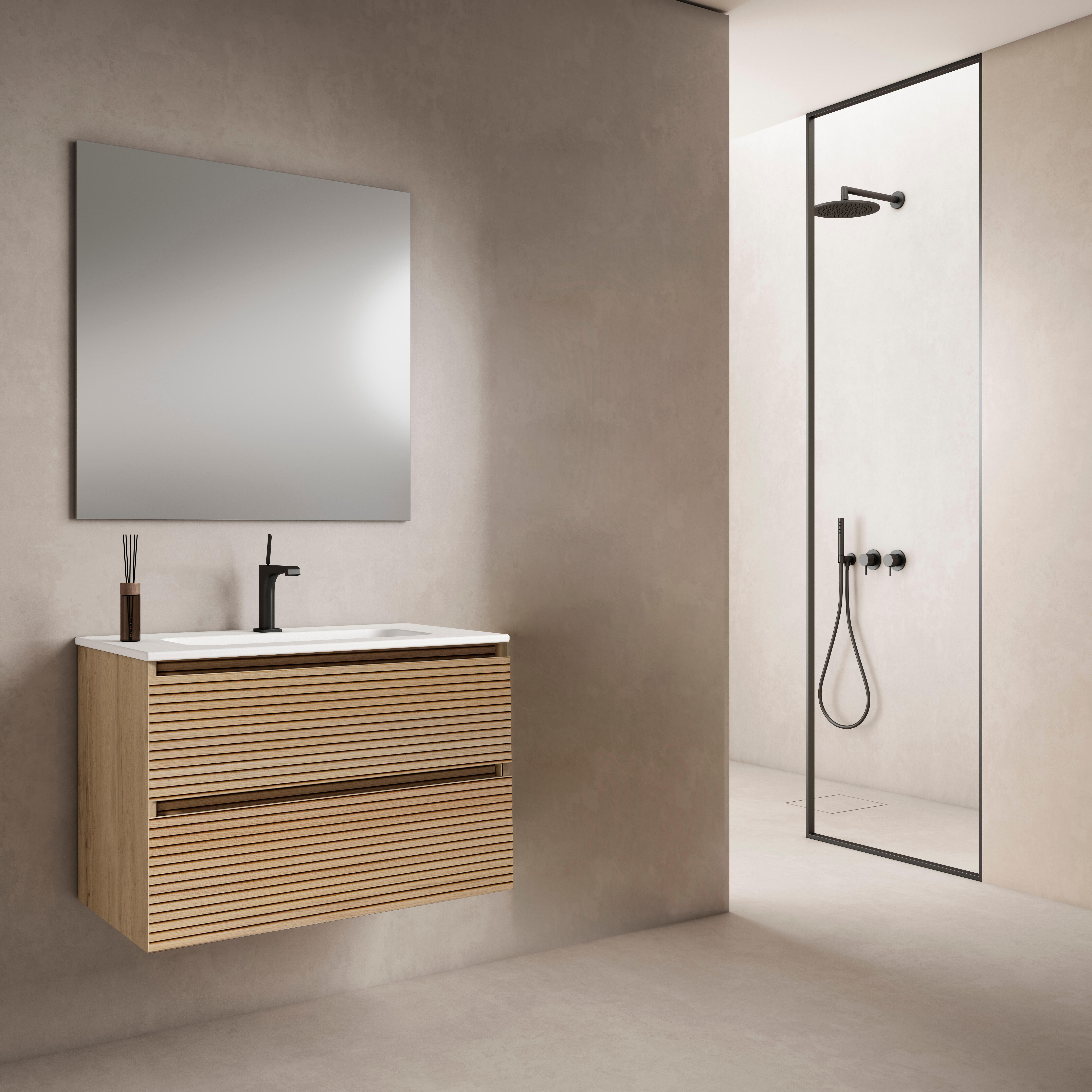 Conjunto de mueble de baño suspendido fabricado en tablero de melamina de 18mm acabado en roble mate. Compuesto por mueble de 79x54x45,5 cm (ancho/alto/profundidad) con composición de 2 cajones metálicos con sistema de cierre amortiguado. Incluye lavabo cerámico con tolerancia 2cm de 81x46 cm y espejo EKO de 80x70 cm (alto/ancho). Grifería no incluida. Certificado FSC (bosque sostenible). Entrega a pie de vehículo. Fabricado en España con 3 años de garantía.