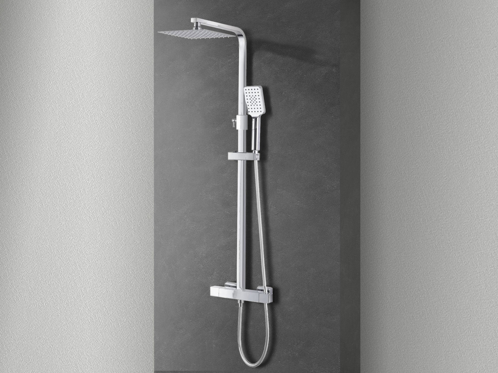 Equipada con un cabezal de ducha rectangular de acero inoxidable, ducha de mano en ABS con manguera flexible, desviador en latón cromado, boquillas de silicona antical y un práctico mezclador termostático.