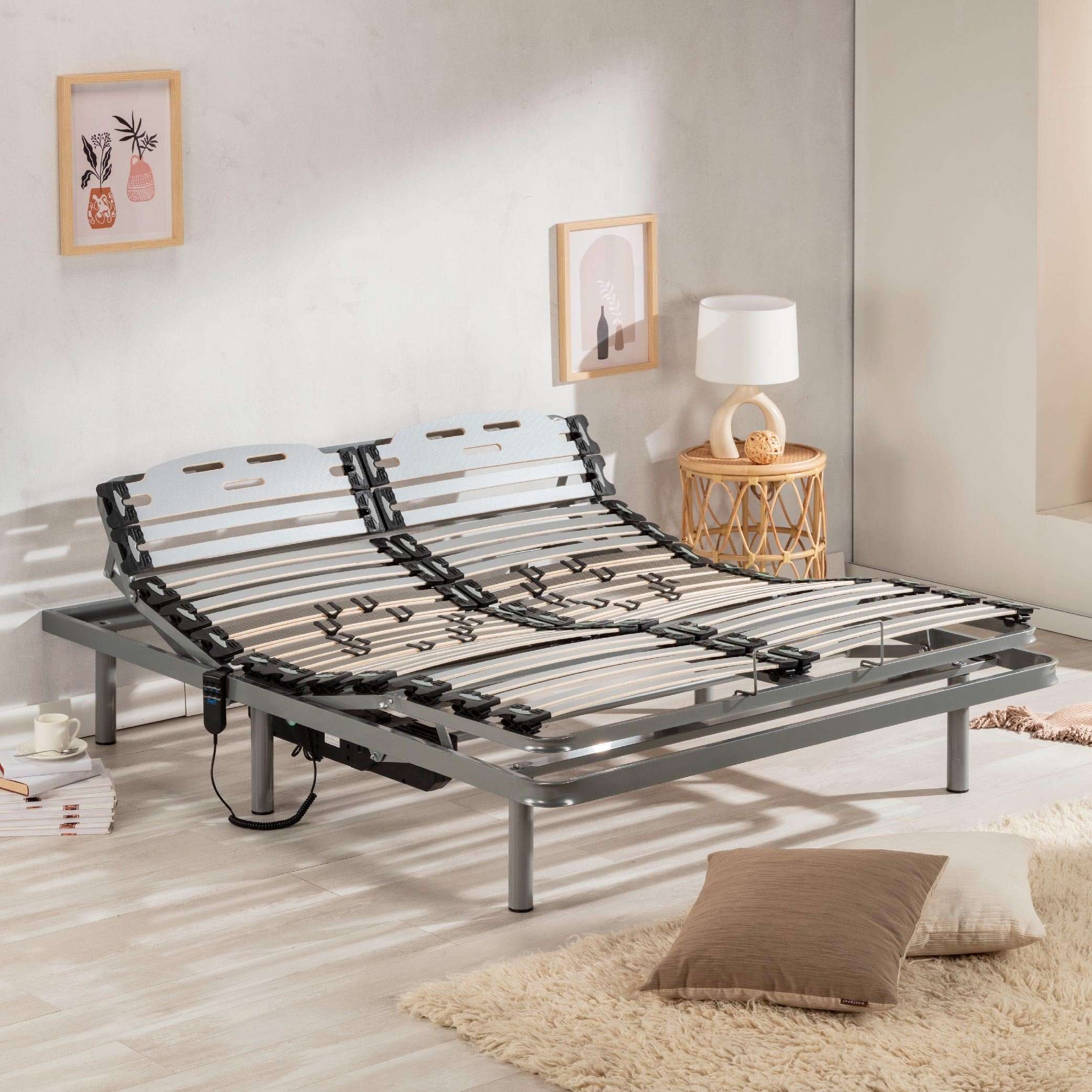 Características 11 LÁMINAS DOBLES DE 10 CM FABRICADAS EN HAYA NATURAL, suspendidas sobre unas amortiguaciones de hytrel con acabado antideslizante y antihumedad, que consiguen más flexibilidad y hacen que se adapte perfectamente a la forma de tu cuerpo, especialmente en la parte lumbar, donde ofrecen un mayor soporte. 5 PLANOS DE ARTICULACIÓN CON MANDO A DISTANCIA para conseguir la postura correcta cómodamente. Incorpórate, eleva las piernas o cambia de posición fácilmente y sin esfuerzo. Además la parte superior cuenta con una lama más ancha para que el colchón no se deforme por la cabeza. RESISTENTE ESTRUCTURA DE ACERO con patas de 25cm de altura que le dan la solidez y durabilidad necesaria, además de soportar perfectamente el peso para mayor seguridad y confort. CURSORES PARA REGULAR LA FIRMEZA según el peso. Ofrece una gran flexibilidad para que puedas adecuado a tus necesidades. Aleja los cursores entre sí para conseguir una mayor firmeza o acércalos si, por el contrario, prefieres menos. Máxima adaptabilidad. FABRICADO EN ESPAÑA e ideal para mejorar el flujo sanguíneo, reducir la hinchazón de piernas, disminuir la tensión corporal, favorecer la respiración y evitar dolores de espalda, hombro, cuello y pelvis.