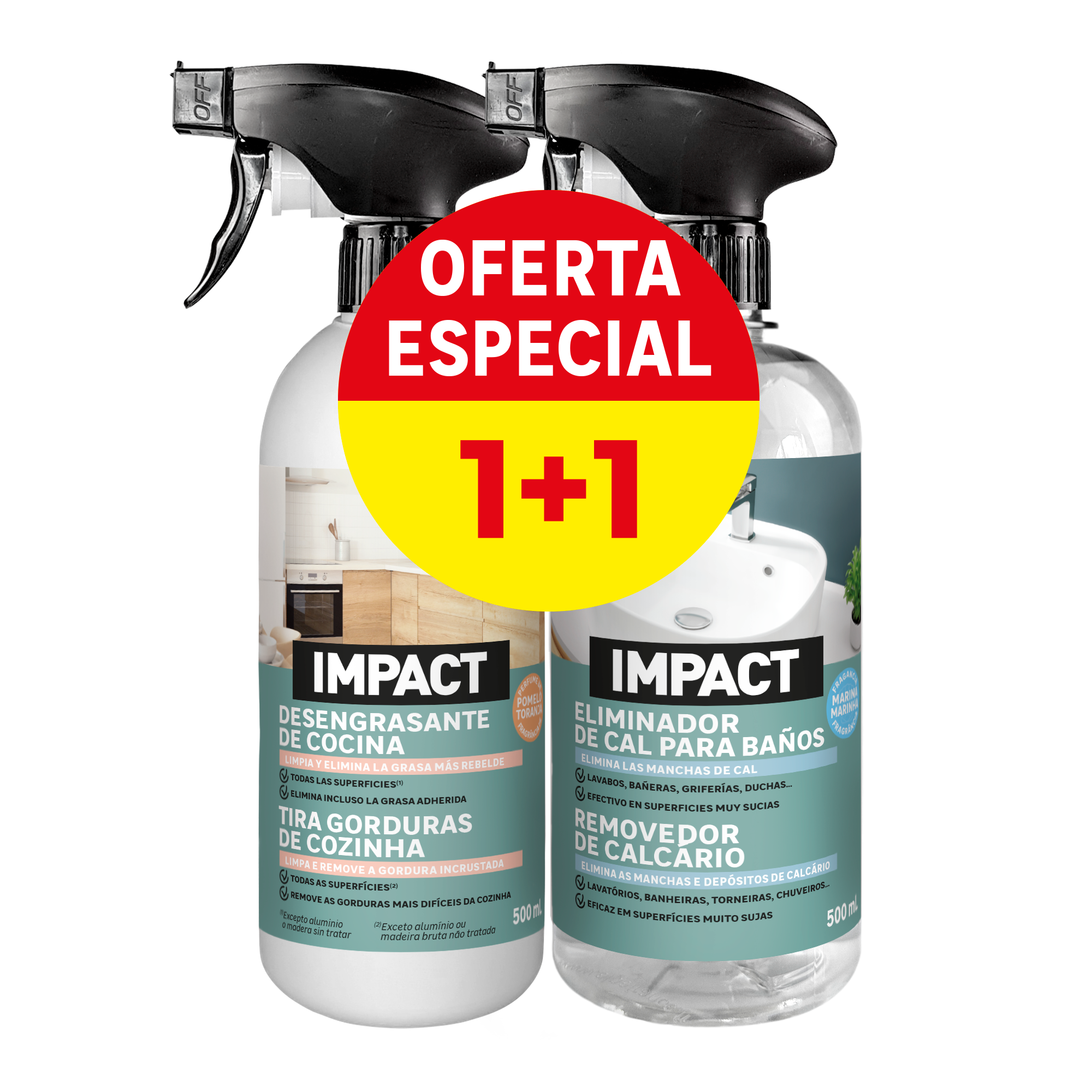 El kit de limpieza Impact 2 en 1 de 500 ml, es ideal para la limpieza de su hogar. Consta de un desengrasante de cocina y un desincrustante de baño. El desengrasante de cocina Impact ultrapotente limpia a fondo y desatasca todas las superficies de su cocina, disolviendo grasas y dejando un agradable olor cítrico. Ideal para horno, vitrocerámica, barbacoa, etc. El desincrustante de baño Impact elimina eficazmente la cal de todas las superficies de su baño, incluso las verticales. Déjalo actuar unos minutos para obtener superficies lisas y limpias. Difunde un agradable aroma marino en la estancia.