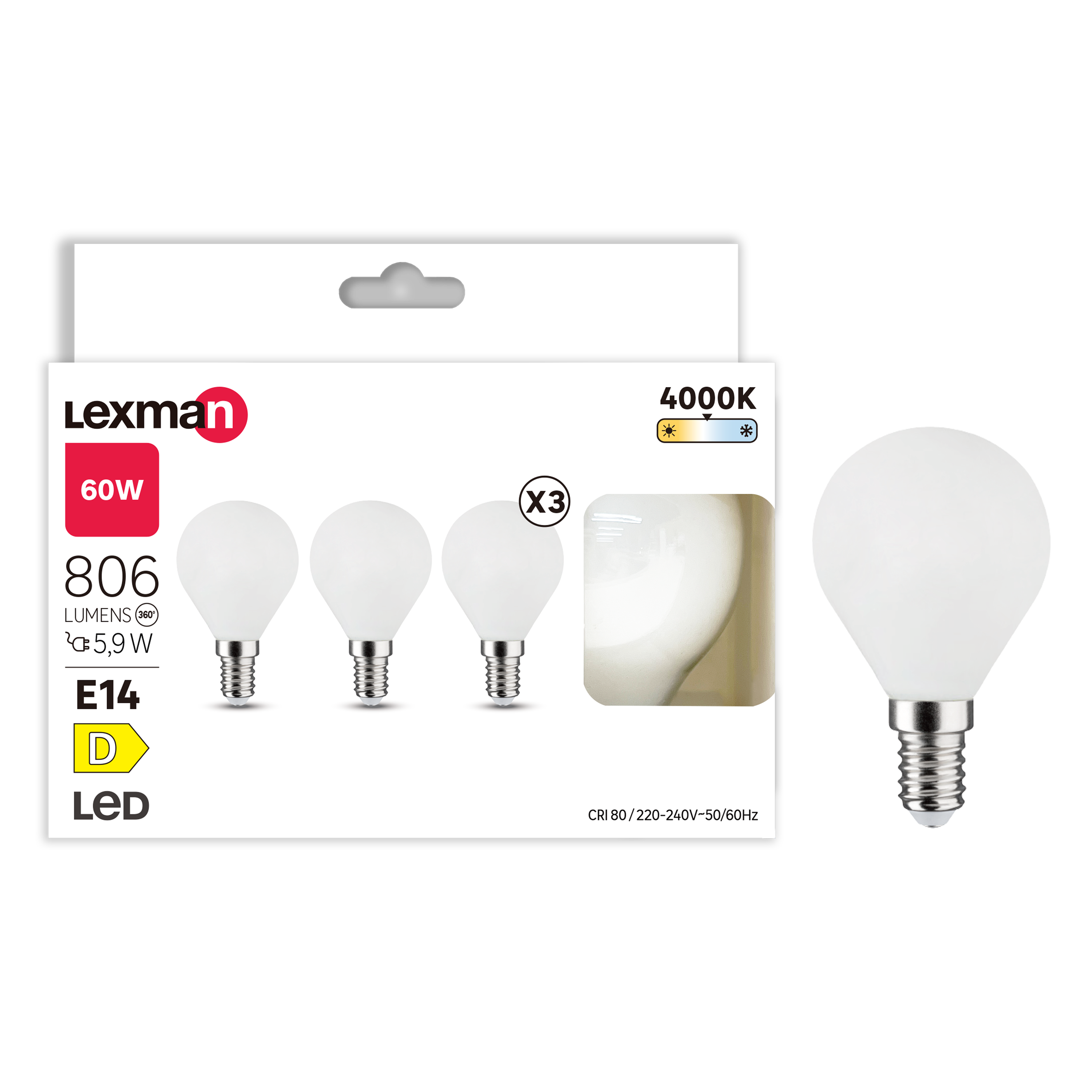 Bombilla led Lexman fabricada en cristal con acabado de color blanco. Cuenta con índice de protección IP20 y casquillo E14. Dispone de 220-240 V de tensión, 5,9 W de potencia de iluminación restituida, haz de 330 grados de ángulo, 4.000 K de temperatura de color, lo que se traduce en una luz color blanco frío. Posee una vida útil de 25.000 horas. Ofrece 5 años de garantía. Etiqueta energética: D. Medidas: 4,5 cm x 78 mm (ancho x alto).