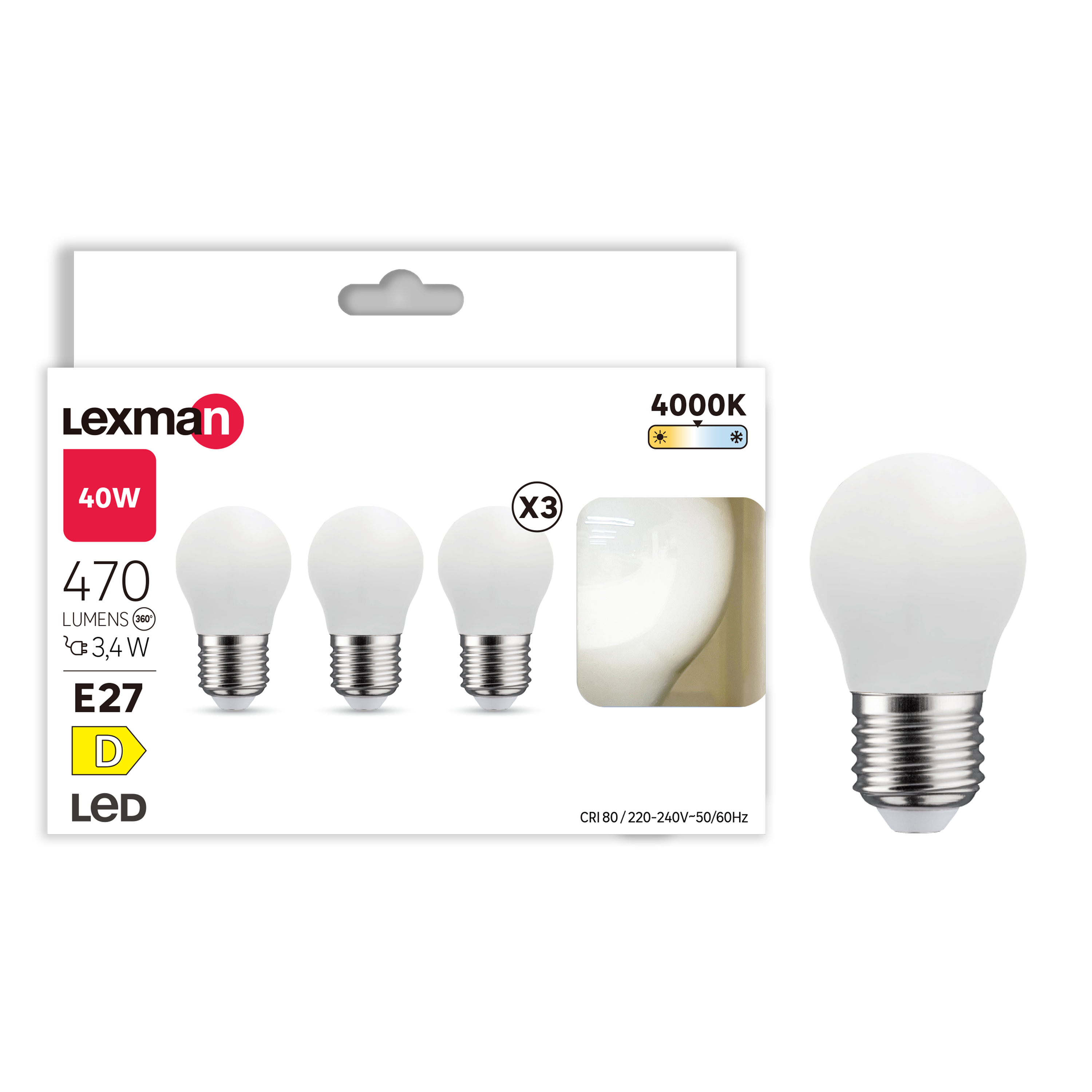 Bombilla led Lexman fabricada en cristal con acabado de color blanco. Cuenta con índice de protección IP20 y casquillo E27. Dispone de 220-240 V de tensión, 3,4 W de potencia de iluminación restituida, haz de 330 grados de ángulo, 4.000 K de temperatura de color, lo que se traduce en una luz color blanco frío. Posee una vida útil de 25.000 horas. Ofrece 5 años de garantía. Etiqueta energética: D. Medidas: 4,5 cm x 77 mm (ancho x alto).