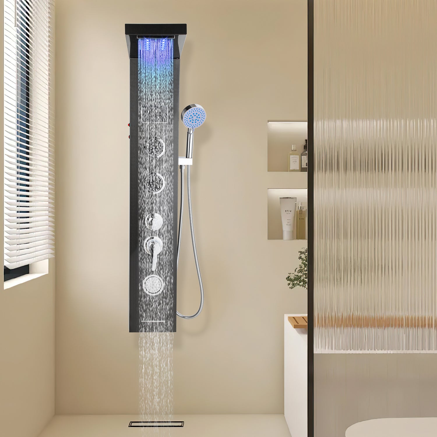 Con múltiples funciones, como ducha tipo lluvia, ducha en cascada, ducha con masaje de espalda, caño para bañera, ducha de mano de acero inoxidable de 1,5 metros y pantalla de temperatura, este panel brinda una experiencia de ducha de lujo, permitiendo que su cuerpo y su mente se relajen y disfruten.