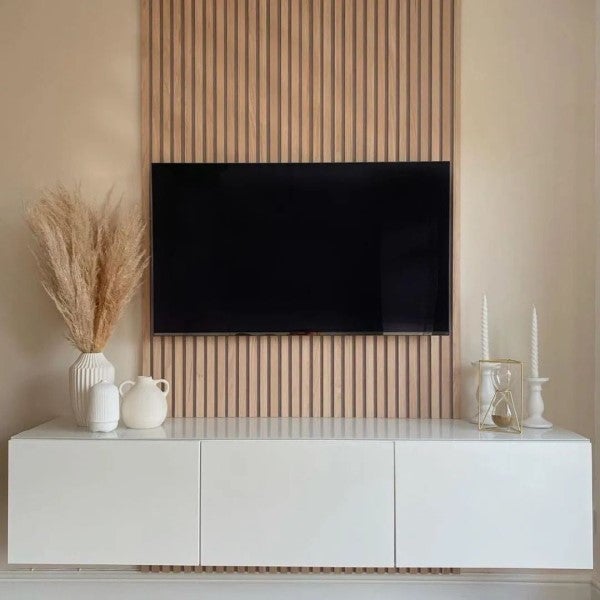 Tienen una cara con una chapa frontal de madera roble auténtico, que está pegada sobre el MDF. Se trata de una capa fina que ha sido cortada con cuidado. Esto se puede ver y sentir claramente, debido a la estructura, esta pared de listones parece real. Este tipo de paneles de madera son utilizados en muchos interiores diferentes, desde estilos de hogar minimalistas hasta clásicos.